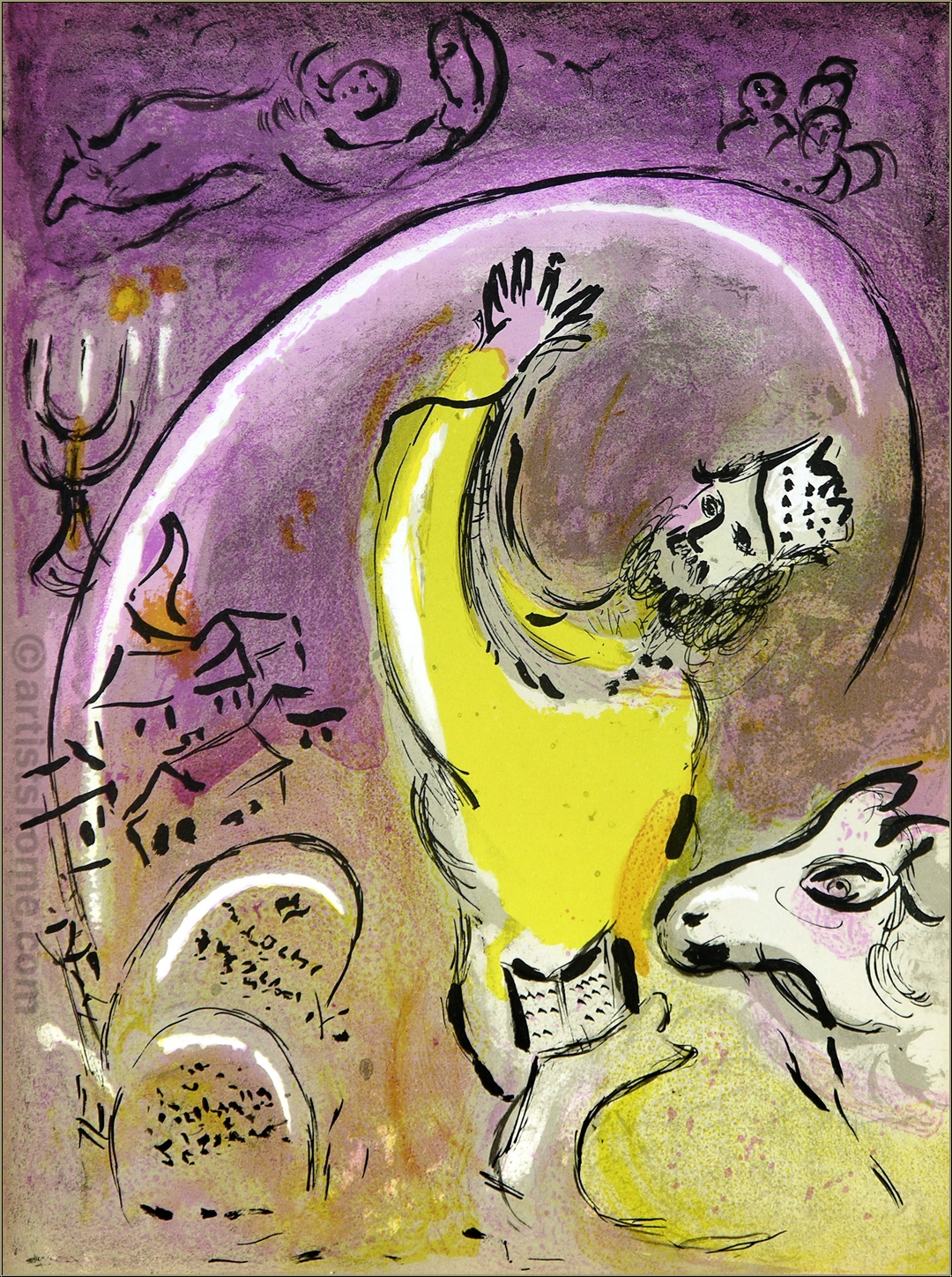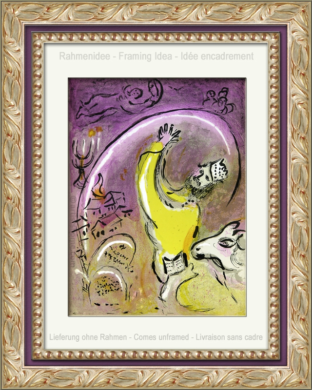 Details:"Salomon" (Die Könige) Salomon gilt als der weiseste aller jüdischen Könige. Noch heute sprechen wir von einem "salomonischen Urteil" und meinen damit eine kluge und weise Entscheidung. Chagall hat den König in diesem Bild mit erhobenen Händen als Lichtgestalt dargestellt. Sicherlich spielt der Künstler damit auf Salomons vertrauensvolle Gottesbeziehung und seine friedliche Regierungspolitik an. Aber seine Krone ist leicht verrutscht... aller Idealisierung des Königs zum Trotz gab es nämlich auch allzu menschliche Seiten an ihm: seine Prunksucht zum Beispiel, die auch zur Ausbeutung der Untertanen führte. Links unten sind die Gesetzestafeln angedeutet, und oberhalb davon der siebenarmige Leuchter - ein Hinweis darauf, dass Salomon den ersten prachtvoll und kostbar ausgestatteten Tempel in Jerusalem bauen ließ. Ein Lichtbogen spannt sich schützend über den König, mit einer scharfen Abgrenzung nach oben. Vielleicht deutet Chagall damit an, dass der König trotz seiner Machtfülle nur Mensch und nicht göttlich ist, wie dies zur gleichen Zeit der Pharao von Ägypten war. Ganz besonders auffällig ist die violette Farbgebung der Grafik. Sie deutet an, dass Salomons Handeln von Gottes Geist durchdrungen und bestimmt war.
