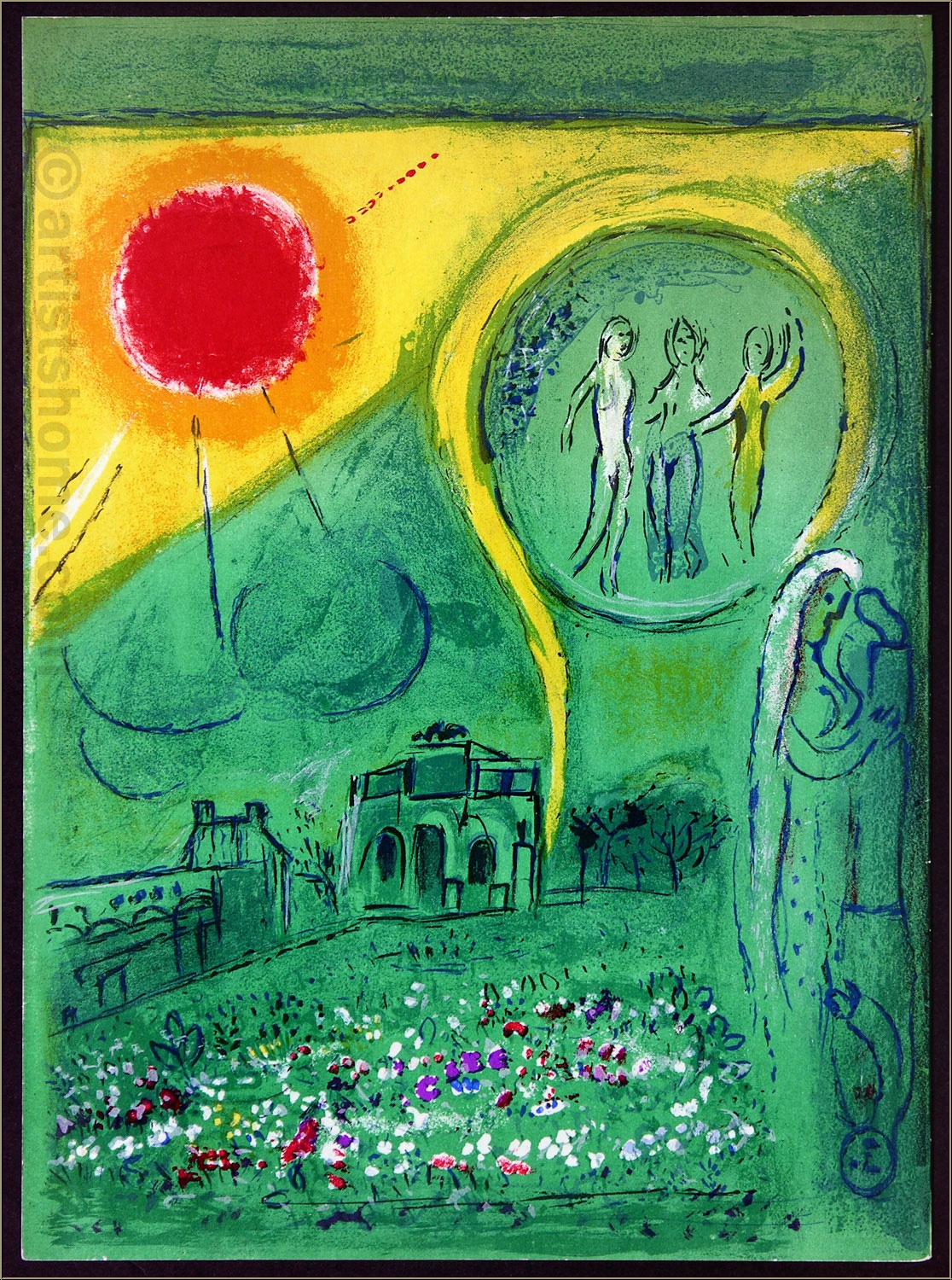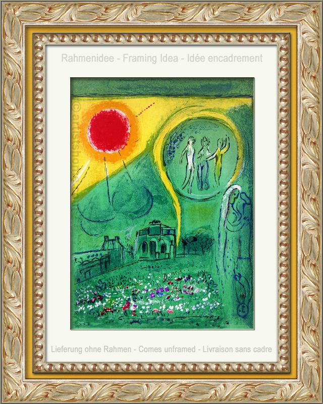 Details:"Le Carrousel du Louvre" Wieviel Zeit Marc Chagall in seiner Pariser Anfangszeit mit intensiven Studien im Louvre verbracht haben muss, lässt sich nur erahnen. Für sein Motiv "Le Carrousel du Louvre" mit Blick auf den Arc de Triomphe und das Musée du Louvre ließ er das satte Grün des Jardin des Tuileries respektlos über die alten Gemäuer hinweg bis in den Himmel wachsen, unterbrochen nur von einer alles überdachenden Sonne. Wer mögen die 3 Wesen sein, die in einer Art Seifenblase über der Szenerie schweben? Auf jeden Fall ist es Frühling, denn es wird oder wurde geheiratet, in der Stadt der Liebe. Warum die Braut ihren Bräutigam allerdings auf den Kopf stellte, darüber darf spekuliert werden.