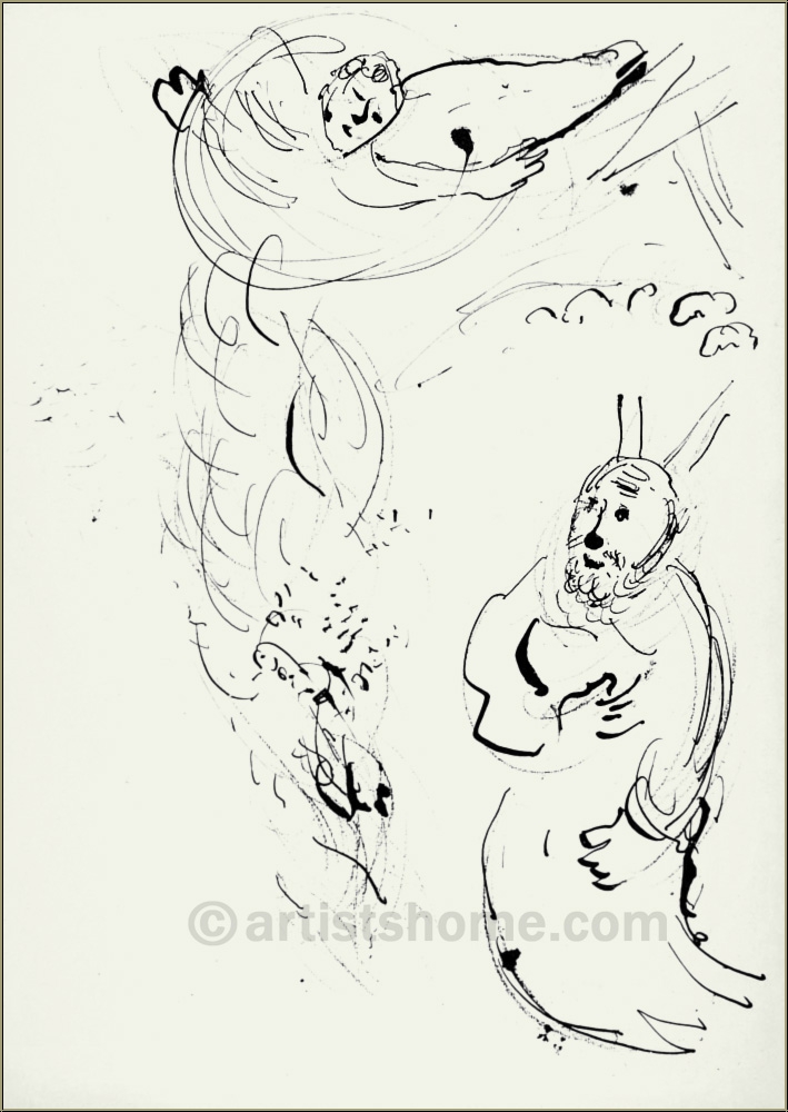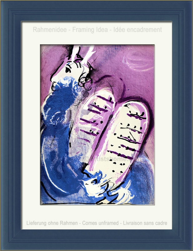| | "Moses" (III, emporschauend) Moses gehört zu den herausragendsten Persönlichkeiten der Geschichte des jüdischen Volkes, der Chagall immer wieder beschäftigte und ihn zu unterschiedlichen künstlerischen Darstellungen veranlasst. Im Auftrag Gottes führte Moses das Volk Israel auf schwierigem Weg aus der Sklaverei Ägyptens in die Freiheit. In der Wüste Sinai schließlich empfing er von Gott die 10 Gebote, die in der jüdischen Tradition als Weisungen bezeichnet werden. "Wenn du Gott liebst, dann wirst du nicht stehlen, lügen, ehebrechen." In diesem dritten Motiv seiner Moses-Grafiken zeigt Chagall ihn, wie er sein Gesicht Gott zuwendet und ganz Auge und Ohr für das ist, was dieser ihm mitteilen möchte. Seine Arme umschließen die steinernen Tafeln mit den Weisungen wie einen kostbaren Schatz. Seine rechte Hand weist hin auf die Bestimmungen, die jedem einzelnen Mitglied in Zukunft ein Leben in Würde, Freiheit und Gerechtigkeit ermöglichen möchten. Das Violett des Hintergrunds deutet die Situation als einen geisterfüllten Augenblick, das Blau symbolisiert die Treue Gottes zu seinem Volk, in guten wie schlechten Tagen. | Technik: | Original-Farblithographie (Steindruck), Mourlot Nr. 125 Rückseitig eine weitere, einfarbige Original-Lithographie (M 130) Hinweis: Dies ist KEIN Kunstdruck (wie z.B. Photo-, Grano- oder Offset-Lithographie aus einer "limitierten Edition"), wie sie zuhauf im Internet zu finden sind, sondern die Original-Lithographie (Steindruck) von 1956, die exakt so auch im Werkkatalog verzeichnet ist. | | Jahr: | 1956 | | Größe: | 35,5 x 26 cm (Darstellung = Blattgröße) | | Auflage / Papier: | Eines von 6.500 unsignierten Exemplaren auf glattem, kräftigen Velin. Zusätzlich wurden 75 vom Künstler signierte und nummerierte Exemplare auf Arches Bütten aufgelegt. | | Verleger: | Éditions de la Revue Verve, Tériade, Paris | | Druck: | Mourlot, Paris | | Anmerkungen: | Bibelstelle(n), auf die sich das Blatt bezieht: Ex 34, 29-31 Neben den Königen, Erzvätern, Engeln und Propheten aus dem Alten Testament hat Marc Chagall in seinem ersten Bibelzyklus auch die Mose-Geschichte bedacht: ihr hat er in diesem Band insgesamt 4 Motive gewidmet - dies ist das dritte Blatt der Folge und bildet den Augenblick ab, in dem Mose der Bedeutung dessen, was sich aus seinem Zwiegespräch mit Gott ergeben hat, gewahr wird. So vorsichtig wie fassungslos hält er die ihm anvertrauten Gebotstafeln in seinen Armen. Die beiden Bände des legendären Kunstmagazins Verve mit seltenen Original-Lithographien von Marc Chagall - "La Bible" und "Dessins pour La Bible" (Bilder zur Bibel) - wurden 1956 und 1960 von dem Kunstkritiker und Verleger Tériade herausgegeben. Seither wurden zahllose Kopien (Kunstdrucke) dieser Lithographien in den Verkehr gebracht, die so wenig mit Originalgrafik zu tun haben, wie die Bilder in einer Tageszeitung.* | Werkverzeichnis/ Referenz: | Cain, Julien, u. Mourlot, Fernand. Chagall Lithograph [I], André Sauret, Monte Carlo 1960, S. 149-160, Nr. 125 + 130 Sie erhalten mit der Lieferung den Auszug aus diesem Verzeichnis, sowie zusätzlich einen Identitätsnachweis (ohne Preisangabe), falls das Blatt verschenkt werden soll. | | Zustand: | Erläuterungen hierzu Wohlerhaltenes, schönes Exemplar! Lieferung: ungerahmt. | Kundenbewertungen Bisher wurde noch keine Bewertung abgegeben. Bewertungen können nur von Kunden geschrieben werden, die den Artikel gekauft haben und eingeloggt sind. Ihre persönlichen Daten werden automatisch anonymisiert (Beispiel: "Jens H., Deutschland").  *Gültig für Lieferungen nach Deutschland bei Zahlung per PayPal. Bei Zahlung per Banküberweisung verlängert sich die Lieferzeit um 1-3 Tage ab dem Tag, an dem Sie überwiesen haben. Lieferzeiten für andere Länder sowie Informationen zur Berechnung des Liefertermins finden Sie hier |