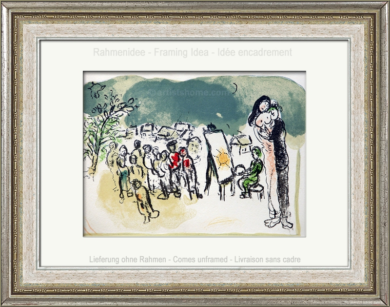 Details:"Hommage à Julien Cain" Als Kulisse für diese zärtlich-sinnliche Liebesszene wählte Chagall ein kleines Dorf auf dem Land, dessen Einwohner einem Maler bei seiner Arbeit zusehen. Marc Chagall, der sich in seinen Selbstportraits zumeist mit Lockenpracht darstellte, dürfte sich in diesem Werk doppelt porträtiert haben: zum einen in seiner Rolle als bekannter Künstler, der das öffentliche Interesse auf sich zieht. Zum anderen als zärtlicher Liebhaber und Verehrer von Frauen, allen voran seiner ersten Ehefrau Bella. Diese sehr private Szene hat Chagall an den äußeren rechten Rand des Bildes gerückt - sie findet jenseits des Trubels um seine Person statt. Julien Cain, dem dieses Werk gewidmet ist, war enger Freund und künstlerischer Weggefährte Chagalls über viele Jahre. Er verfasste u.a. zwei der sechs Bände des Werkverzeichnisses zu Chagalls Druckgrafik.