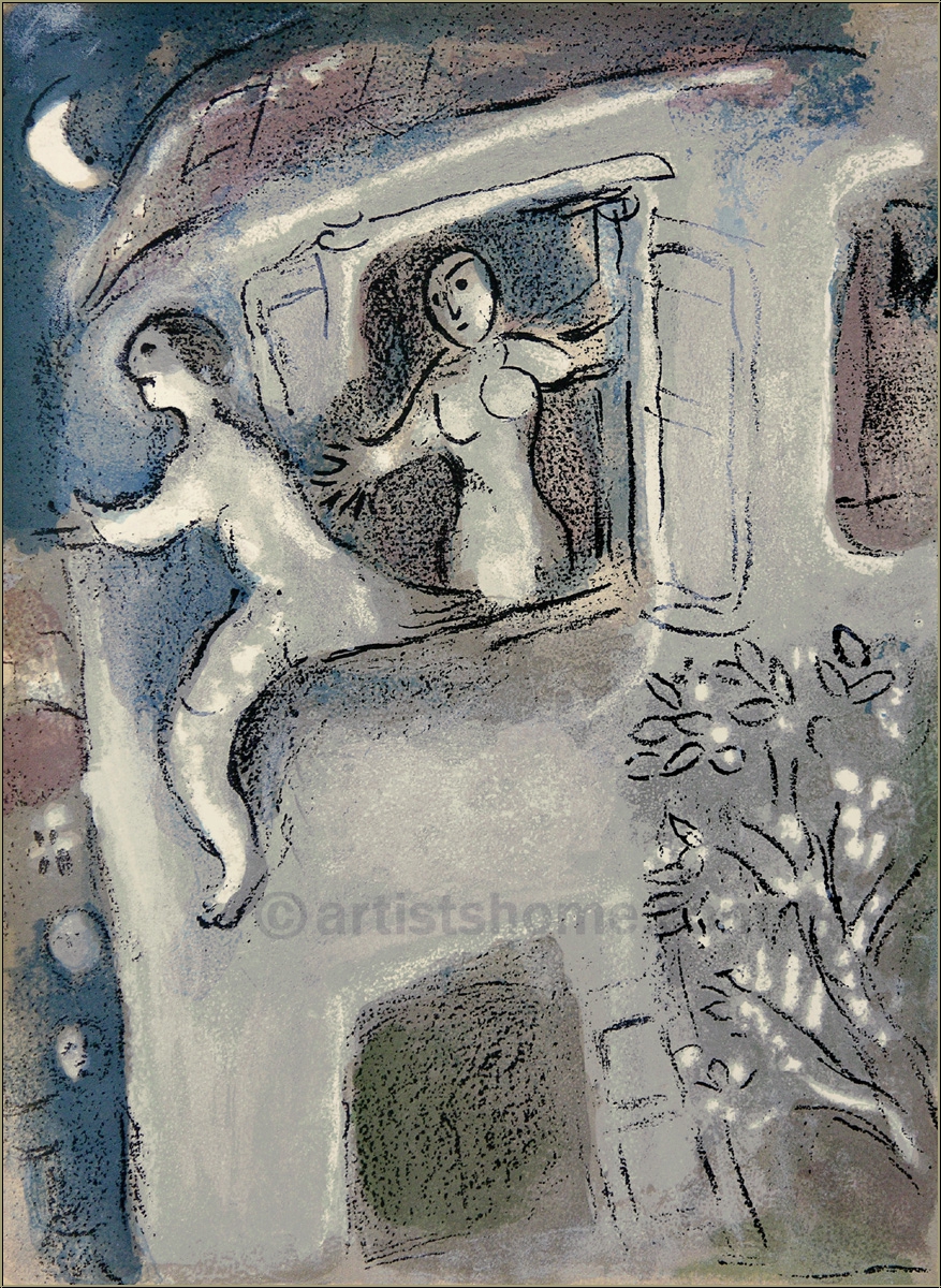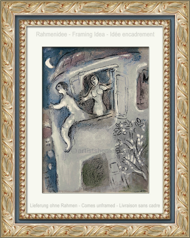 | | "Michal rettet David" Vor unseren Augen spielt sich eine aufregende Szene bei Finsternis ab. Angedeutet wird die Nacht von einer Mondsichel oben links im Bild, die das Schauspiel in fahles Licht taucht. Marc Chagall macht uns mittels leicht schimmerndem Weiß, lasierendem Graublau und fließendem Violett zu Zeugen der Flucht Davids vor Sauls Männern, die ihn töten sollen. Zurück bleibt Michal, seine Ehefrau, die ihn gerade noch rechtzeitig vor den Plänen ihres Vaters warnen und zur Flucht drängen konnte. Wie kaum einem anderen gelingt es Chagall, mit seiner Zeichnung den Moment des Sturzes einzufrieren und den Ausgang der dramatischen Szene offen zu lassen. Dies ist KEIN Kunstdruck (z.B. Foto- oder Grano-Lithographie aus einer "Limitierten Luxus-Edition", wie sie zuhauf angeboten werden), sondern die Original-Lithographie aus Chagalls Bibel II, wie sie exakt so auch im maßgeblichen Werkverzeichnis vermerkt ist! | Originalauflage: | 6.500 unsignierte Exemplare auf Velin + 50 nummerierte und signierte Expl. auf Arches Bütten | | Größe: | 35,5 x 26 cm (Darstellung = Blattgröße) | | Verleger: | Éditions de la Revue Verve, Teriade, Paris, 1960 | | Anmerkungen: | Rücks. eine weitere, einfarbige Original-Lithographie (Mourlot 273); Bibelstelle(n), auf die sich das Blatt bezieht: Sam 19, 8-18 Die wichtige Doppelausgabe des legendären Kunstmagazins Verve mit seltener Originalgrafik von Marc Chagall - "La Bible" und "Dessins pour La Bible" (Bilder zur Bibel) wurde 1956 und 1960 von dem Kunstkritiker und Verleger Tériade in 6.500 Exemplaren herausgegeben. Seither wurden zahllose Kopien der Originallithographien (Kunstdrucke) in den Verkehr gebracht, die so wenig mit Originalgrafik zu tun haben, wie die Bilder in einer Tageszeitung. | Werkverzeichnis/ Referenz: | Mourlot, F., Chagall Lithograph [II] 1957-1962, A. Sauret, Monte Carlo 1963, N° 250 + 273, m. Abb. Sie erhalten mit der Lieferung den Auszug aus diesem Verzeichnis, sowie zusätzlich einen Identitätsnachweis (ohne Preisangabe), falls das Blatt verschenkt werden soll. | Wenn Sie sich zum Kauf von Originalgrafik entschlossen haben, finden Sie hier nützliche Tipps, um nicht auf häufig als "Originale" angebotene Reproduktionen (Kunstdrucke) oder gar signierte Fälschungen hereinzufallen. | | Kundenbewertungen ( 1) 5/5 Kundenbewertungen bei originalgrafik.de:Jede Verbraucherbewertung wird vor ihrer Veröffentlichung auf ihre Echtheit überprüft, sodass gewährleistet ist, dass Bewertungen nur von Verbrauchern stammen, die die bewerteten Produkte auch tatsächlich erworben haben. Diese Überprüfung geschieht a) durch Übermittlung individualisierter Links nach Abschluss einer Online-Bestellung, die zu einem Online-Bewertungsformular führen und sicherstellen, dass der Zugang zur Bewertungsfunktion nur solchen Verbrauchern gewährt wird, die ein Produkt auch tatsächlich erworben haben, oder b) dadurch, dass die Möglichkeit einer Bewertungsabgabe von einer vorherigen Anmeldung in dem registrierten Kundenkonto abhängig gemacht wird, von dem aus ein Kauf getätigt wurde. 5 1 5 28.07.2013 - Gisela G., Deutschland 2013-07-28 2013-07-28 Bewertungen können nur von Kunden geschrieben werden, die den Artikel gekauft haben und eingeloggt sind. Ihre persönlichen Daten werden automatisch anonymisiert (Beispiel: "Jens H., Deutschland").  *Gültig für Lieferungen nach Deutschland bei Zahlung per PayPal. Bei Zahlung per Banküberweisung verlängert sich die Lieferzeit um 1-3 Tage ab dem Tag, an dem Sie überwiesen haben. Lieferzeiten für andere Länder sowie Informationen zur Berechnung des Liefertermins finden Sie hier |