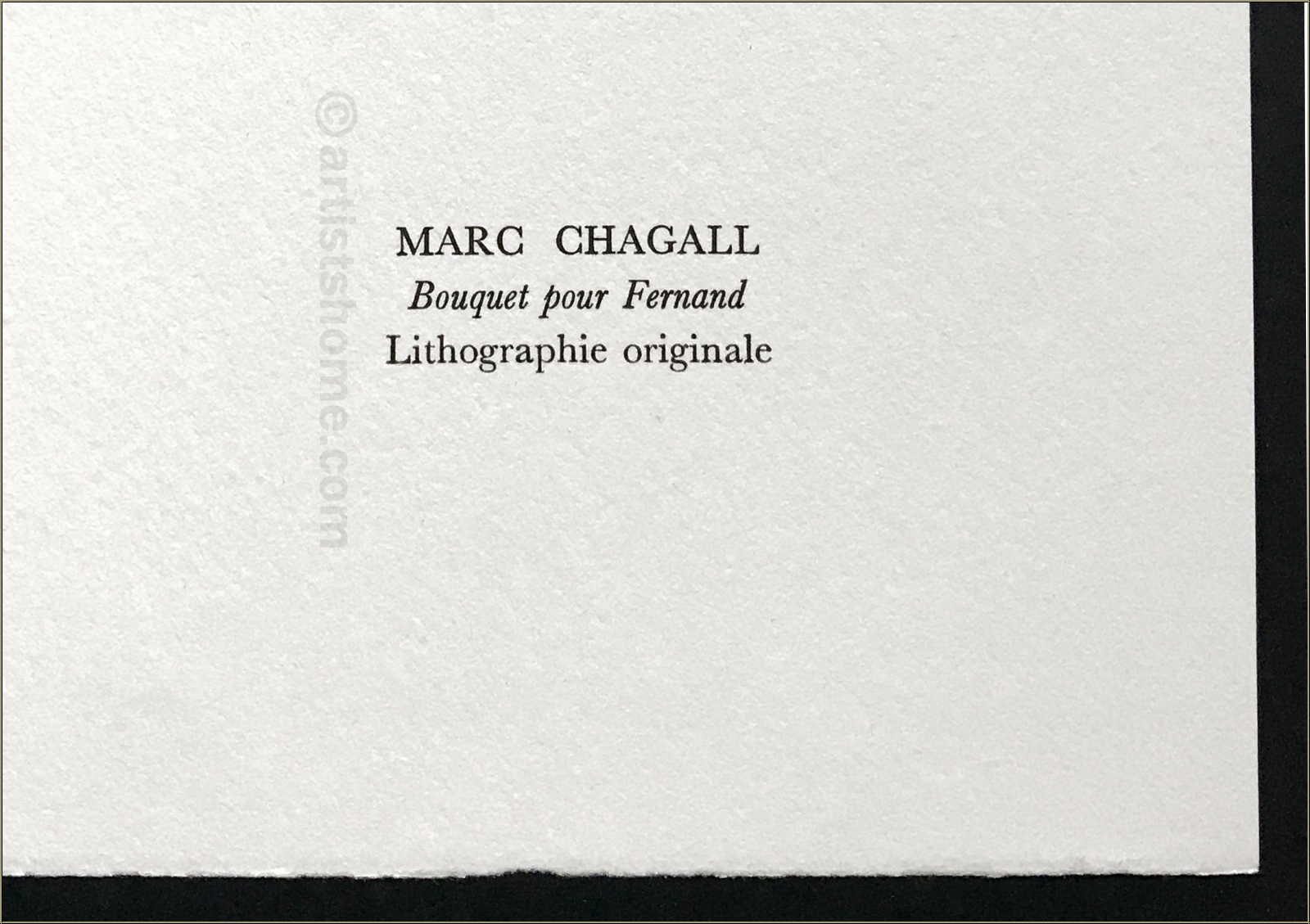 | | "Bouquet pour Fernand" Seltene Original-Farblithographie auf Arches Bütten von Marc Chagall für Fernand Mourlots Portfolio "Souvenirs et portraits d'artistes" (Vorzugsausgabe). Dies ist KEINE später gedruckte Massenware (Kunstdruck wie z.B. Grano- oder Offset-Lithographie), sondern die Original-Lithographie aus der Vorzugsausgabe von Mourlots Buch über sein Lebenswerk, wie sie exakt so auch im Werkkatalog verzeichnet ist. ACHTUNG: aktuell werden im Netz identisch aussehende Drucke angeboten - hierbei handelt es sich um gefälschte Nachdrucke (Raubkopien). Diese Grafiken sind KEINE Original-Lithographien, auch wenn sie auf der Rückseite mit "Lithographie originale" bedruckt und für den Laien kaum zu unterscheiden sind! | Auflage / Jahr: | 800 unsignierte Exemplare der Vorzugsausgabe | | Größe: | 32,5 x 25 cm (Blattgröße) | | Verleger: | Alain C. Mazo, Paris, 1972 | | Anmerkung: | Rücks. typografisch bezeichnet: Marc Chagall - Bouquet pour Fernand - Lithographie originale. | Werkverzeichnis/ Referenz: | Mourlot, F., Chagall Lithograph [IV] 1969-1973, André Sauret, Monte Carlo 1974, S. 100, Nr. 635, m. Abb. [1971] Sie erhalten mit der Lieferung den vollständigen Auszug aus dem o.g. Werkverzeichnis sowie zusätzlich einen Identitätsnachweis (ohne Preisangabe), falls das Blatt verschenkt werden soll. Außerdem erhalten Sie eine Kopie der Impressumseite mit der Nummerierung aus der Originalkassette zu Ihrem Blatt. | | | Kundenbewertungen Bisher wurde noch keine Bewertung abgegeben. Bewertungen können nur von Kunden geschrieben werden, die den Artikel gekauft haben und eingeloggt sind. Ihre persönlichen Daten werden automatisch anonymisiert (Beispiel: "Jens H., Deutschland").  *Gültig für Lieferungen nach Deutschland bei Zahlung per PayPal. Bei Zahlung per Banküberweisung verlängert sich die Lieferzeit um 1-3 Tage ab dem Tag, an dem Sie überwiesen haben. Lieferzeiten für andere Länder sowie Informationen zur Berechnung des Liefertermins finden Sie hier |