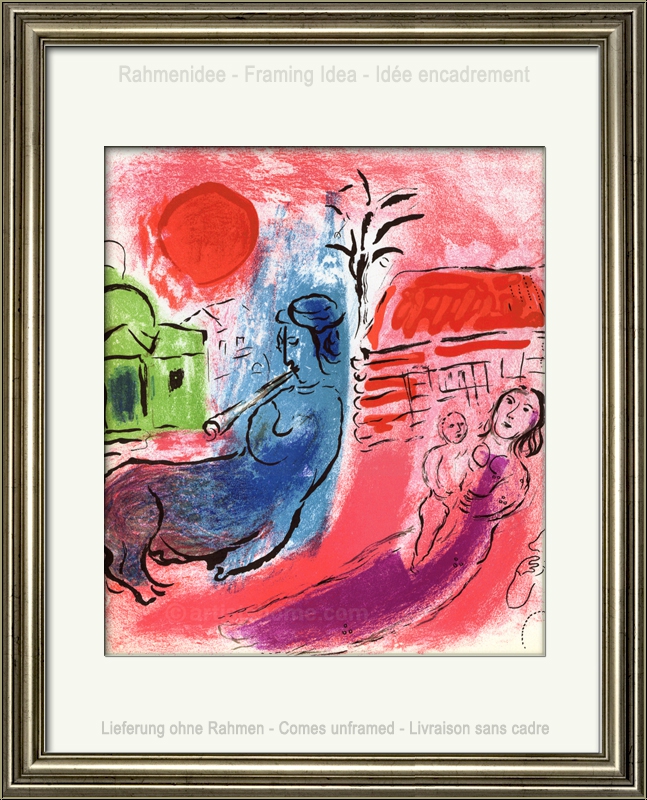 Details:"Mutterschaft und Kentaur" (Maternité au Centaure) Man müsste tief in die griechische Mythologie und den Stammbaum der Götter einsteigen, um die Gedankengänge im Einzelnen nachvollziehen zu können, die Marc Chagall zu diesem Bild bewogen haben. Der musizierende Kentaur (Zentaur) jedenfalls scheint von ihm in friedlicher Absicht neben Mutter und Kind platziert worden zu sein, denn die in leuchtenden Rosa- und Rottönen gemalte Szene strahlt Harmonie und Frieden aus. Kentauren waren in Kunst und Literatur in allen Epochen ein gerne verwendetes Symbol bzw. eine Allegorie für die Wahrheit.