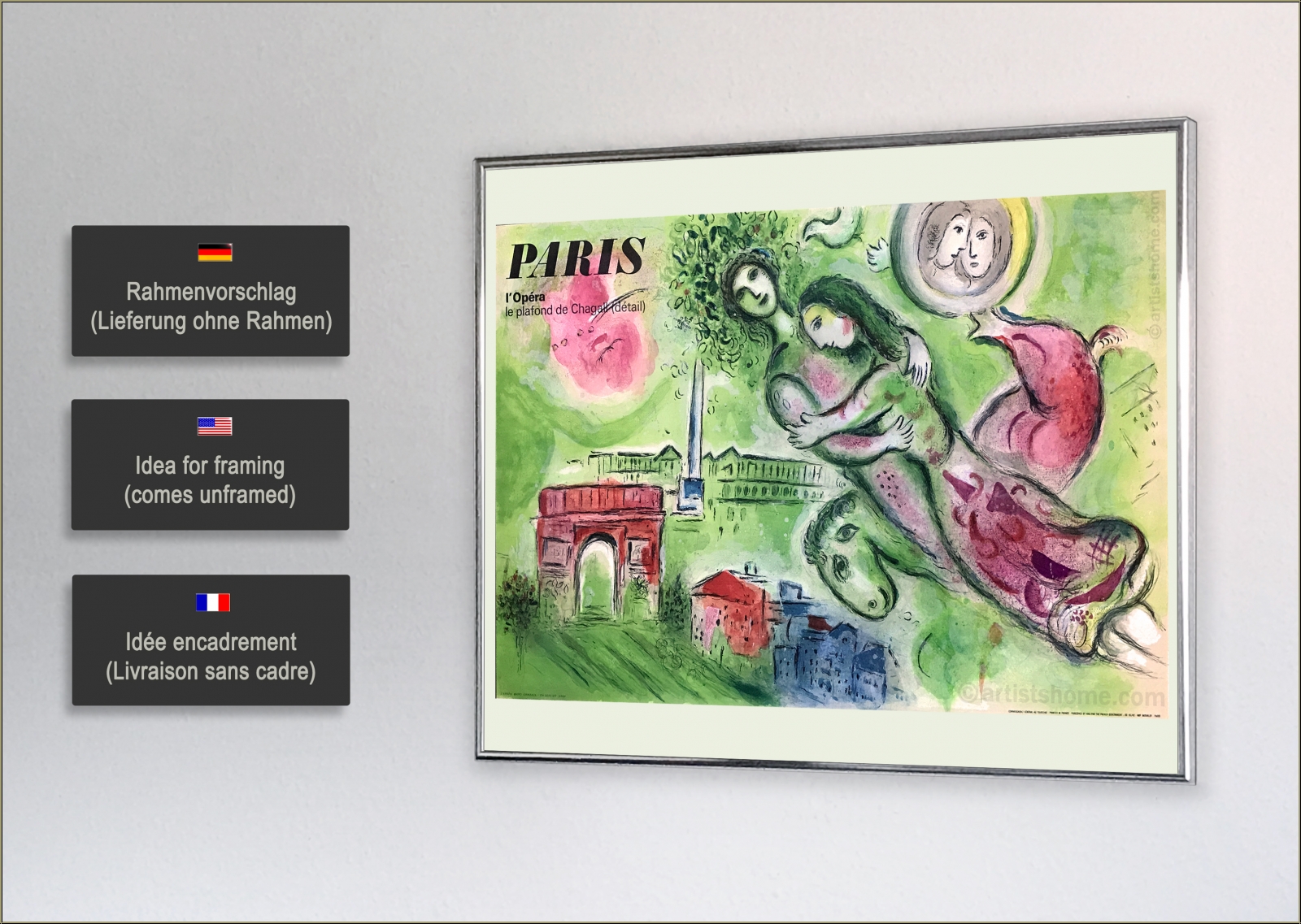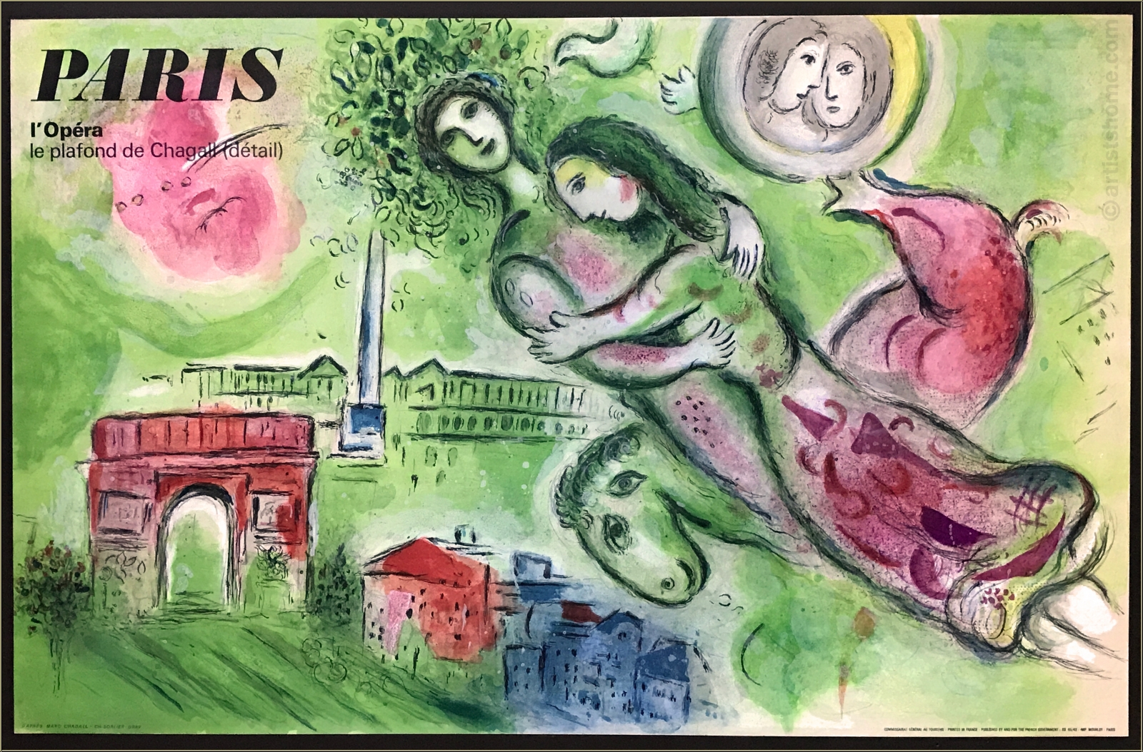 Details:"Romeo und Julia" Paris l'Opéra, le plafond de Chagall (1964) Für das romantischste seiner Originalplakate hat Chagall den Ausschnitt seines Deckengemäldes für die Pariser Oper gewählt, der das tragische Liebespaar Romeo und Julia über der Stadt der Liebe schweben lässt. Auftraggeber dieses herrlichen Künstlerplakates war seinerzeit das französische Fremdenverkehrsbüro, das damit für einen Besuch der Oper in Paris werben wollte. Zudem sind auch weitere Wahrzeichen wie der Place de la Concorde und der Arc de Triomphe darauf zu bestaunen. Das Plakat wurde nach zahlreichen Vorentwürfen Chagalls durch den Meisterlithographen Charles Sorlier bei Mourlot ausgeführt, in den zarten Pastelltönen eines verliebten Frühlingstags.