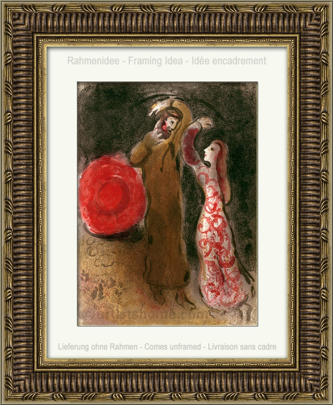 Details:"Ruths Treffen mit Boas" Hier lässt uns Chagall an der ersten Begegnung zwischen Ruth und Boas teilhaben, die sich - wie es scheint - wild gestikulierend gegenüber stehen. Ein Blick in die beiden Gesichter zeigt jedoch: hier wird nicht gestritten, im Gegenteil - in der Sprache der Bibel weist der linke Arm, den beide jeweils halbkreisförmig nach rechts über ihren Köpfen gestreckt halten, auf eine aus dem Herzen, dem Guten und Wahren stammende Handlung hin. Vermutlich wollte Chagall damit die Freundlichkeit und Großzügigkeit Boas' betonen, mit der dieser die fremde Ausländerin empfängt, nachdem er von ihrem Fleiss beim Ährensammeln erfahren hatte (Rut 2,4 ff). Die warmen Braun- und Rottöne in diesem Bild strahlen Harmonie und Geborgenheit aus und verraten bereits, was als nächstes geschehen wird... Marc Chagall hat dem Kapitel der Ruth eine Folge von 5 Grafiken gewidmet - dies ist das dritte Blatt zu der Frau, die durch ihre Liebe, Treue und Beharrlichkeit zu Boas Ehefrau und somit zur Urmutter König Davids wird.