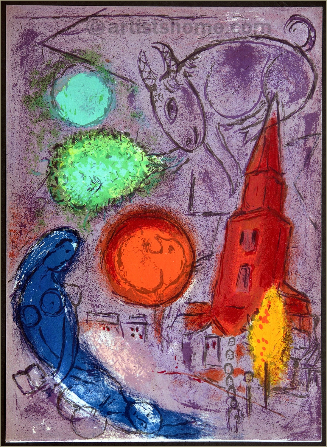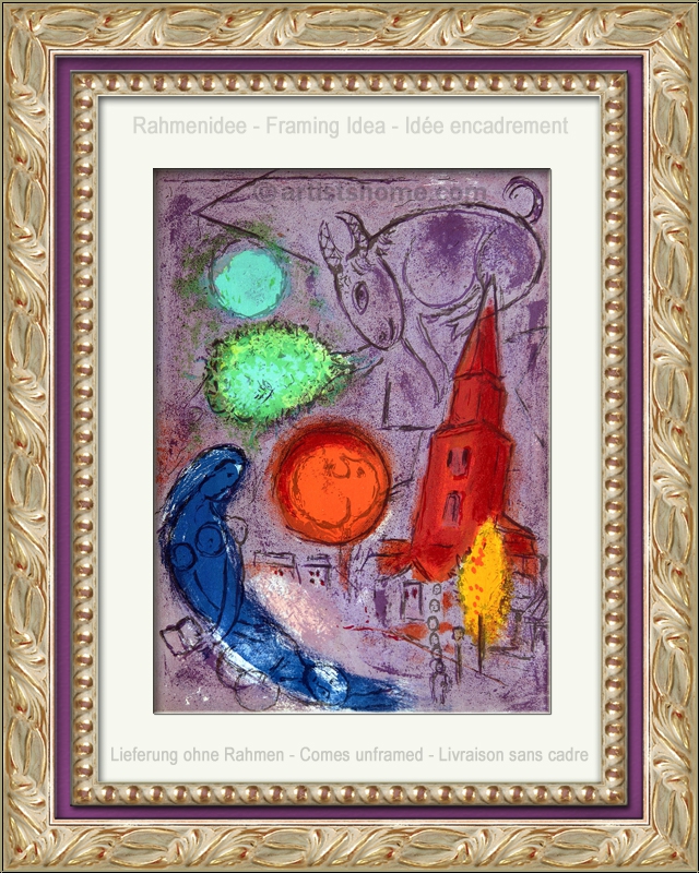 Details:"Saint-Germain-des-Prés" "Für meine Kunst brauchte ich Paris so nötig, wie ein Baum das Wasser", pflegte Chagall zu sagen, wenn er nach den Gründen für den Weggang aus seiner russischen Heimat gefragt wurde. Er schien zu ersticken in der Schweigsamkeit, Schwermut und Farblosigkeit, die ihm Liosno, Witebsk und auch sein familiäres Umfeld zu jener Zeit vermittelt haben müssen. Paris wurde zu Chagalls zweiter Heimat, und das Kunst- und Literatenviertel Saint-Germain-des-Prés, im 6. Arrondissement gleich neben dem Quartier Latin gelegen, dürfte für ihn die ersehnte Freiheit verkörpert haben. Dessen bunte Vielseitigkeit spiegelt sich in diesem Bild wider, unterstrichen durch die bemerkenswerte Wahl der Farben: wer sonst als Chagall käme wohl auf die Idee, ein gedämpftes Violett mit leuchtendem Orange und Türkis zu kombinieren?