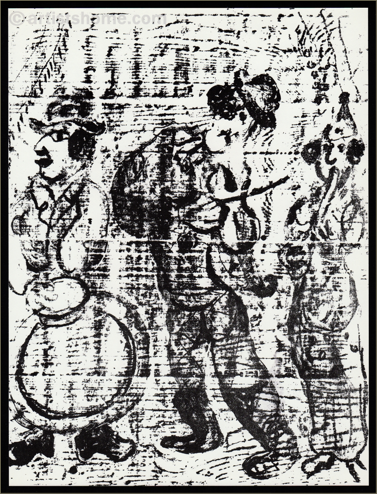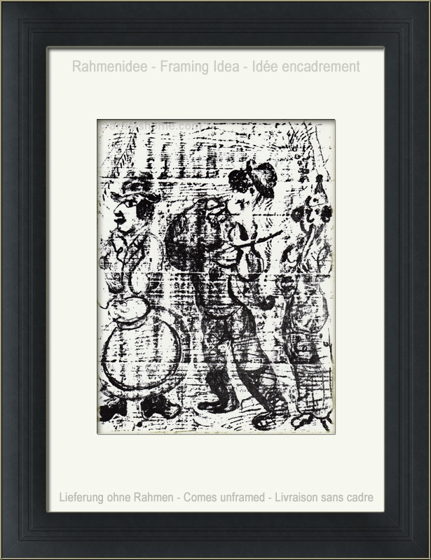 | | "Straßenmusikanten" - Les Musiciens Vagabonds Hier sehen wir drei musizierende Akteure aus der Welt des Zirkus: Einen Dompteur, der das Tamburin schlägt, einen Fiedler mit seinem Instrument, und den Klarinette spielenden Clown. Diesen Steindruck hat Chagall in der Optik eines Holzschnittes mit dessen typischer Schraffur bzw. Maserung gearbeitet. | Technik: | Original-Lithographie (Steindruck) "Les Musiciens Vagabonds" (Mourlot Nr. 396) Hinweis: Dies ist KEIN späterer Kunstdruck, sondern die Original-Lithographie, wie sie exakt so auch im Werkkatalog verzeichnet ist! | | Jahr: | 1963 | | Auflage/Papier: | Hier ein Exemplar aus der unsignierten Originalauflage auf kräftigem Vélin. Zusätzlich wurden damals 150 Exemplare auf Arches Bütten mit breitem Rand abgezogen und vom Künstler signiert u. nummeriert. | | signiert: | unsigniert, wie erschienen. | | Verleger: | Éditions André Sauret, Monte-Carlo, 1963 | | Anmerkung: | Für die maßgeblichen Bände über sein lithographisches Gesamtwerk schuf Marc Chagall zwischen 1960 und 1974 insgesamt 28 blattgroße Original(!)-Lithographien, die in späteren Jahren als Kunstdrucke auf Büttenpapier reproduziert wurden und heute oft mit den Originalen verwechselt werden. | Werkverzeichnis/ Referenz: | Mourlot, Fernand. Chagall Lithograph [III] 1962-1968, André Sauret, Monte Carlo, 1969, Nr. 396 Sie erhalten mit der Lieferung den vollständigen Auszug aus dem o.g. Werkverzeichnis zu Ihrem Blatt sowie zusätzlich einen Identitätsnachweis (ohne Preisangabe, falls das Blatt verschenkt werden soll). | | | Kundenbewertungen Bisher wurde noch keine Bewertung abgegeben. Bewertungen können nur von Kunden geschrieben werden, die den Artikel gekauft haben und eingeloggt sind. Ihre persönlichen Daten werden automatisch anonymisiert (Beispiel: "Jens H., Deutschland").  *Gültig für Lieferungen nach Deutschland bei Zahlung per PayPal. Bei Zahlung per Banküberweisung verlängert sich die Lieferzeit um 1-3 Tage ab dem Tag, an dem Sie überwiesen haben. Lieferzeiten für andere Länder sowie Informationen zur Berechnung des Liefertermins finden Sie hier |
