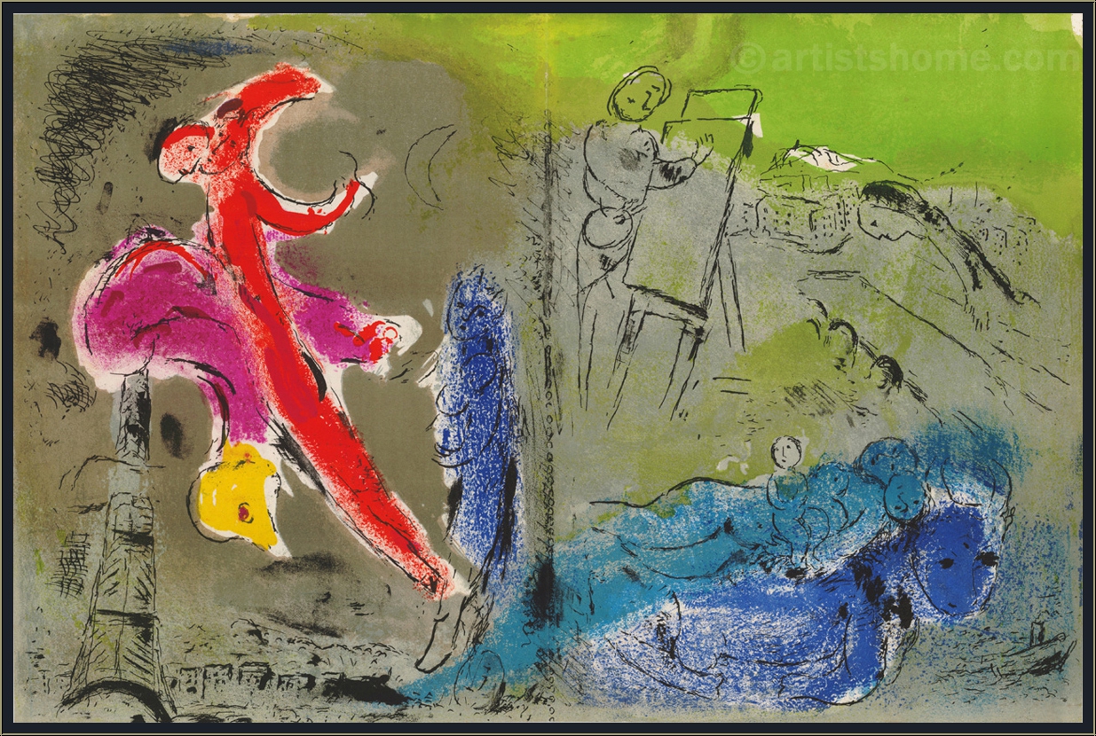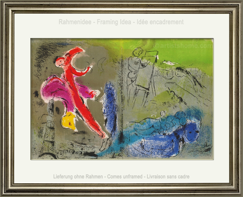 Details:"Vision von Paris" mit "Schwarze Sonne über Paris" und "L'Arc de Triomphe" Es gibt vieles zu entdecken in diesem farbenfrohen Bild, darunter einige typische Figuren und Symbole, die Chagall immer wieder in seinen Werken inszenierte: der Maler mit seiner Staffelei, wie so oft mit verdrehtem Kopf. Die beiden Gesichter eines Paares vor einer roten Mondsichel, darunter ein Chagallsches Phantasietier, das kopfüber vom Eiffelturm zu purzeln scheint. Dicht daneben eine Frau mit ihrem Kind auf dem Arm, dem Betrachter zugewandt. Rechts unten der diesmal in blau gezeichnete Esel, der ein liegendes Paar mit Kind auf seinem Rücken trägt. Und zwischendrin immer wieder kleine Impressionen der Stadt, die Chagall so liebte. Für seinen berühmten Verve-Zyklus von 1952 "Vision de Paris" mit Bildern zu seiner Wahlheimatstadt arbeitete Marc Chagall drei herrliche Farblithographien - dieses ist das größte Werk daraus und wurde als Doppelseite gedruckt. Auf der Rückseite des Blattes befinden sich zwei weitere Originalgrafiken.