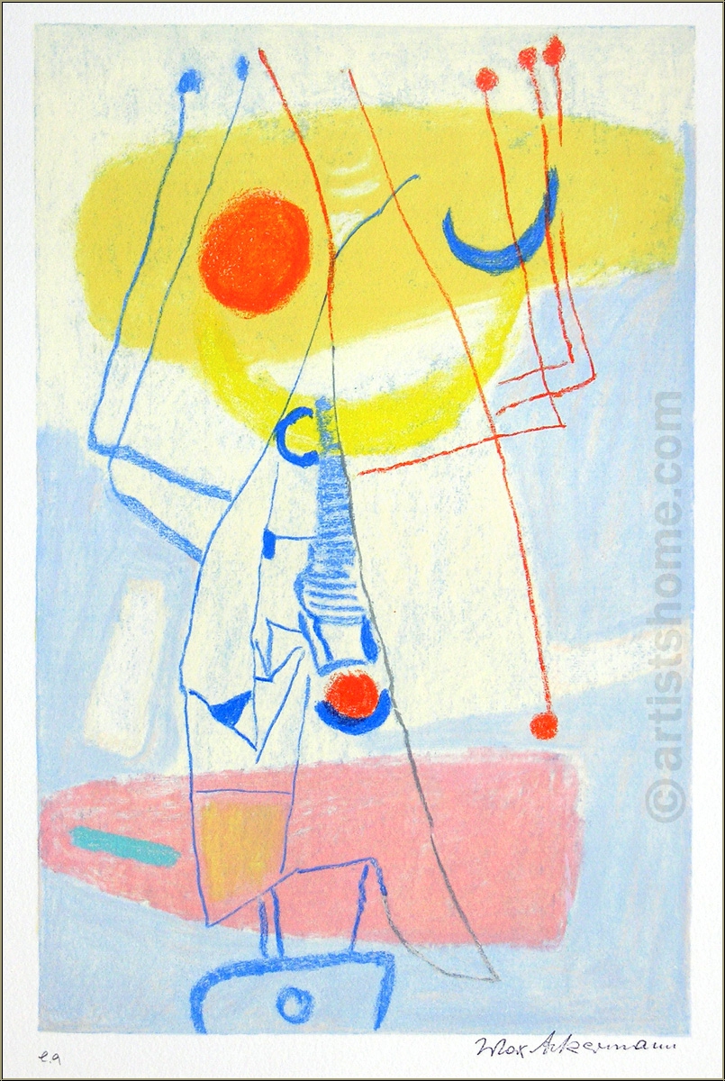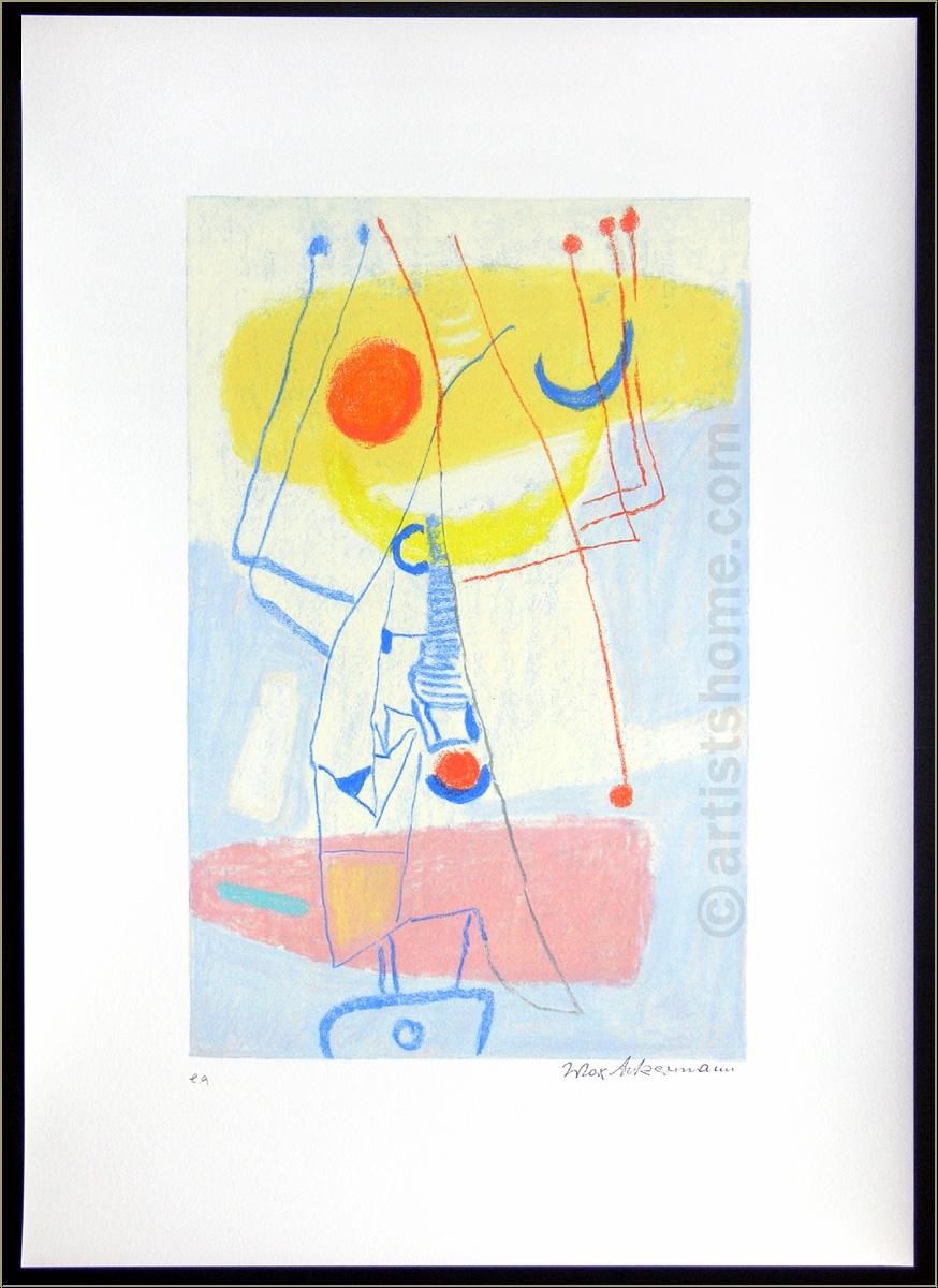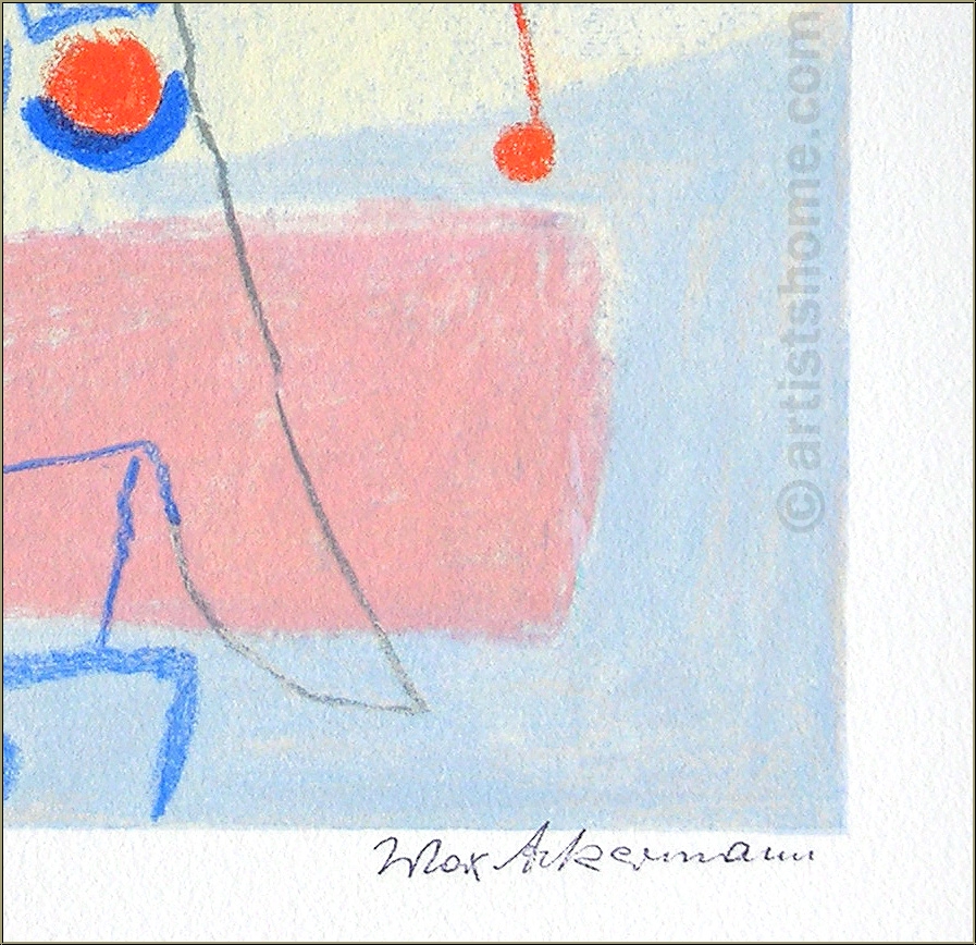 Details:"Heitere Gestade 1965" Dieser in 7 Farben gedruckte Siebdruck wurde von Hans-Peter Haas nach dem 1965 entstandenen, gleichnamigen Pastell Ackermanns ausgeführt. Anders als bspw. dessen "Klangsäulen" und "Farbtürme" führt diese Grafik den Betrachter, analog zum Titel, in lichtdurchflutetes Ufergelände mit ungewohnt zarten Tönen. Nach dem Tod von Max Ackermann wurden in seinem Nachlass 6 Gemälde gefunden, die er ausdrücklich für die Umsetzung als Siebdrucke markiert hatte. Sie wurden von H.-P. Haas, der für Ackermann auch zu Lebzeiten die Siebdrucke ausführte, in bewährter Manier angefertigt und als Abschluss des grafischen Werkes des Künstlers in das Werkverzeichnis aufgenommen.