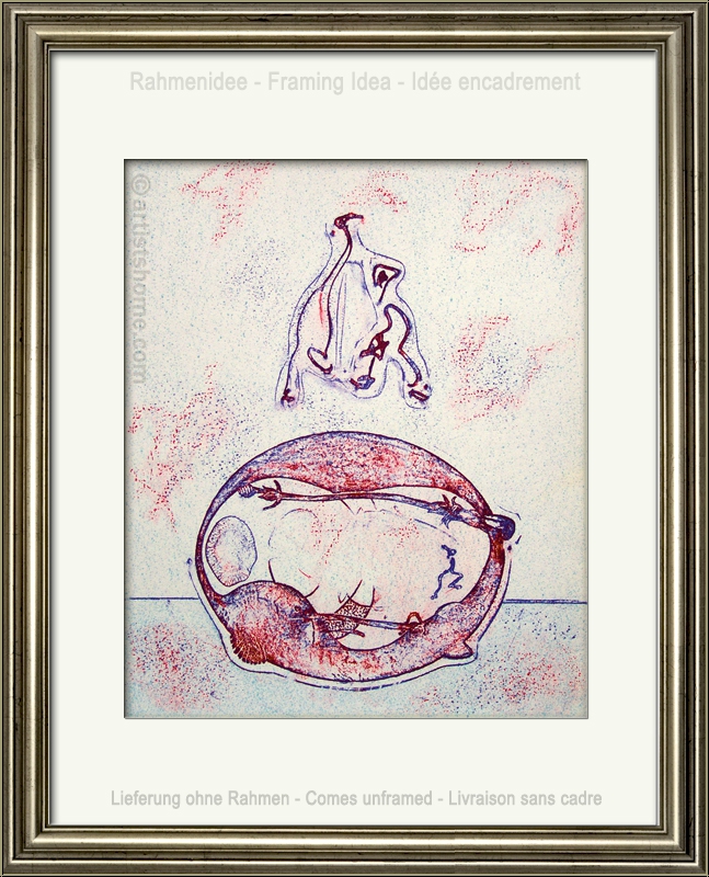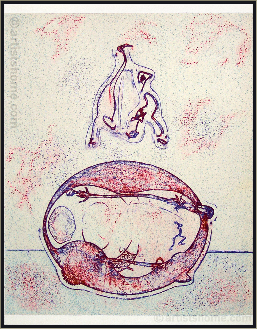 Details:Original-Farblithographie "Nach mir das 20. Jahrhundert", 1971 Als Max Ernst diese Lithographie arbeitete, war er bereits 80 Jahre alt und beschäftigte sich augenscheinlich mit der Zeit nach seinem Tod, wie der Titel vermuten lässt. Ungeachtet dessen schuf er in diesem Jahr insgesamt knapp 50 Grafiken für Suiten, Mappenwerke und Veröffentlichungen über ihn (Biographien), was von ungebrochener Kreativität und Produktivität zeugt.