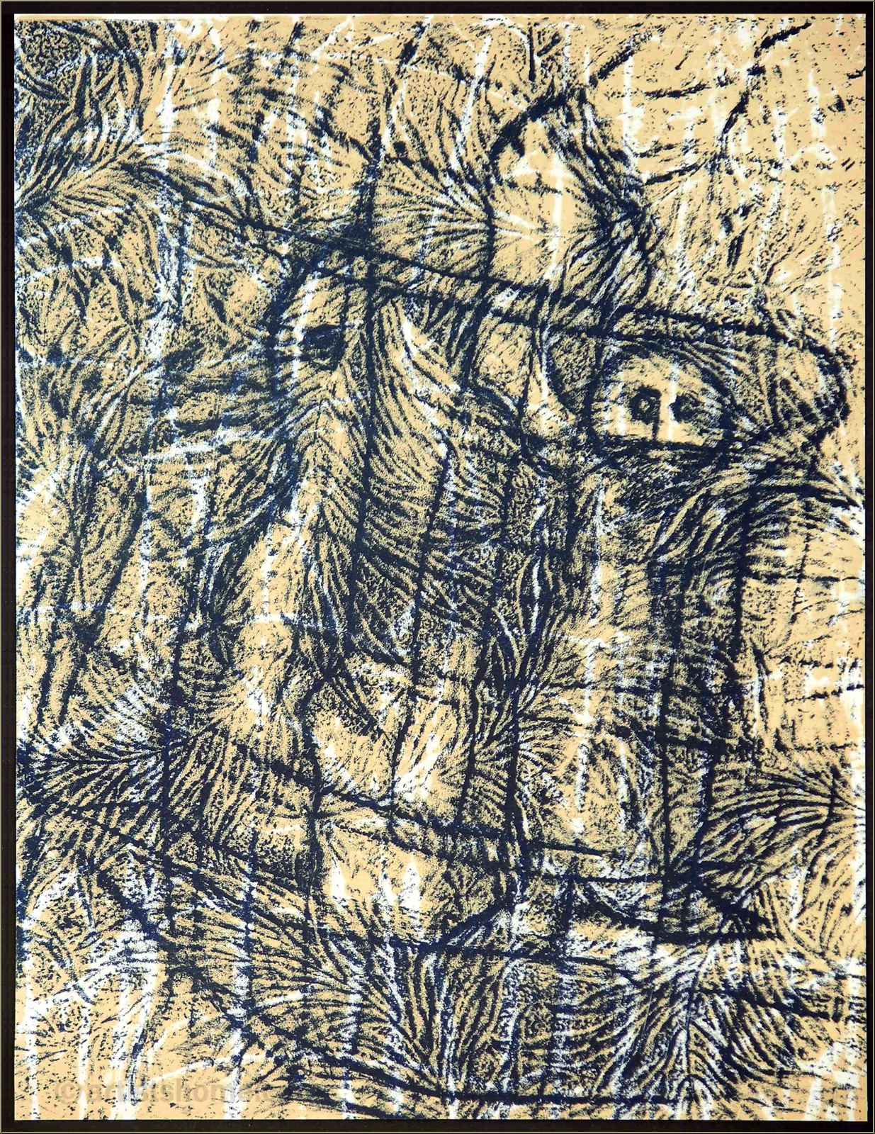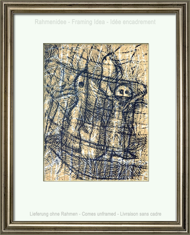 Details:"Un chant d'amour" (Ein Liebeslied) Im unten benannten Werkkatalog steht zu diesen 3 Werken: "Der Zauberwald beherrschte als durchgehendes Motiv auch die Graphiken des Jahres 1958. (...) Die netzartige Gitterstruktur (...) überlagert in der Farblithographie « Un chant d'amour » das florale Dickicht, das an die Strukturen der Radierung zu René Crevel erinnert." Schemenhaft sind zwei Wesen zu erkennen, die miteinander zu tanzen scheinen.