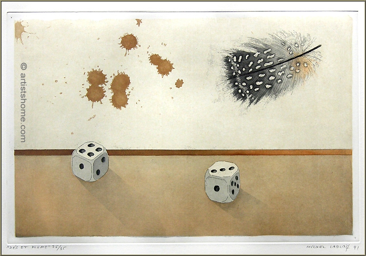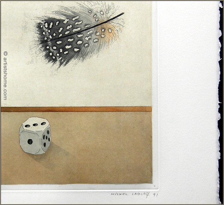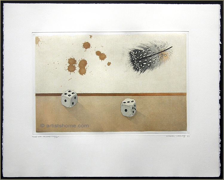 | | "Dés et Plume" (Würfel und Feder - 1991) Zwei Würfel, der eine mit vier, der andere mit drei Augen, und eine sanft auf sie herabschwebende Vogelfeder. Dazu einige wie zufällig passierte Farbkleckse, die die Harmonie dieser Würfelspiel-Szene zu stören scheinen. Tiefsinnige und ungewöhnlich aufwendige Original-Farbradierung auf dickem BFK Rives Bütten. Vom Franzosen Michel Lablais handsigniertes, betiteltes, datiertes und nummeriertes Exemplar in makellosem Zustand. | Auflage: | Eines von nur 35 signierten und nummerierten Exemplaren (die Nummerierung Ihres Blatt kann von der hier gezeigten abweichen). | | Größe: | 46 x 57 cm (Blatt) - 27,5 x 41,5 cm (Darstellung) | | Papier: | Schöner, gratiger Abzug auf kräftigem BFK Rives Bütten. Aufwändig abgezogen und mit farbiger, aufgewalzter Chinapapiereinlage im Druckspiegel hergestellt. | | Drucker: | Atelier Lacourière, Paris (mit deren Trockenstempel), 1991 | | | Kundenbewertungen Bisher wurde noch keine Bewertung abgegeben. Bewertungen können nur von Kunden geschrieben werden, die den Artikel gekauft haben und eingeloggt sind. Ihre persönlichen Daten werden automatisch anonymisiert (Beispiel: "Jens H., Deutschland").  *Gültig für Lieferungen nach Deutschland bei Zahlung per PayPal. Bei Zahlung per Banküberweisung verlängert sich die Lieferzeit um 1-3 Tage ab dem Tag, an dem Sie überwiesen haben. Lieferzeiten für andere Länder sowie Informationen zur Berechnung des Liefertermins finden Sie hier |