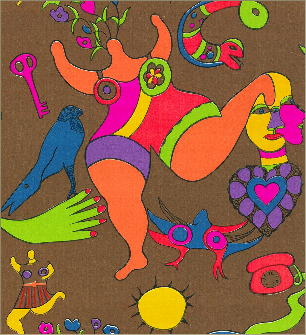 | | "Nana" (auf braunem Grund) Ihr direkter, frecher und oftmals auch provozierender Umgang mit unorthodoxer, praller Weiblichkeit machte ihre tanzenden Nana-Skulpturen weltberühmt. In Niki de Saint Phalles druckgrafischen Bildern haben die Nanas zwar nur Bilderrahmenformat, lassen aber an Direktheit, knallbunter, rundlicher Schönheit und unartigem Benehmen nichts vermissen. In ihrer 1972 auf der documenta 5 in Kassel gezeigten Kunst-Tapete gruppierte die Künstlerin um die im Mittelpunkt stehende große, schwarze Nana mit neonfarbenem Trikot weitere Symbole in leuchtenden Farben: Schlange, Falke, Doppelgesicht, Blumen, Sonne, Schlüssel, Telefon, Hand, Herz und ein fliegendes Fabelwesen. Hier ein Original-Abschnitt der legendären "ART Wallpaper Collection" (Künstlertapete) im Format 58 x 53 cm, das sich wunderbar rahmen lässt. | Beschreibung Projekt: | Die Idee, moderne Kunst in Form von erschwinglichen Tapeten-Designs einem breiteren Publikum zugänglich zu machen, wurde bereits Anfang des letzten Jahrhunderts von Gropius und Le Corbusier verwirklicht. 1971 gelang es dann der Schweizer Gruppierung ART Collection, so bekannte Künstler wie Paul Wunderlich, Jean Tinguely, Niki de Saint Phalle, Allen Jones, Werner Berges u.a. für die "ART Walls Collection" zu gewinnen. Die Künstler gestalteten jeweils Segmente in der Größe von ca. 58 x 53 cm, die anschließend im Siebdruckverfahren von der renommierten "Marburger Tapetenfabrik" in Kirchhain auf Rollen gedruckt und auf der documenta 5 in Kassel vorgestellt wurden. Heute sind diese Tapetenwerke zur kultigen Reminiszenz an das siebziger Jahre Pop-Art Design geworden. | | Drucktechnik: | Farbsiebdruck mit leuchtenden Neon-Elementen | | Größe: | 58 (Höhe) x 53 (Breite) cm | | Papier: | Kräftiges, typisches Tapetenpapier | | Zustand: | Erläuterungen hierzu Schönes, farbfrisches Exemplar. Segment von der Originalrolle, der Versand erfolgt ebenfalls gerollt. | | | Kundenbewertungen Bisher wurde noch keine Bewertung abgegeben. Bewertungen können nur von Kunden geschrieben werden, die den Artikel gekauft haben und eingeloggt sind. Ihre persönlichen Daten werden automatisch anonymisiert (Beispiel: "Jens H., Deutschland").  *Gültig für Lieferungen nach Deutschland bei Zahlung per PayPal. Bei Zahlung per Banküberweisung verlängert sich die Lieferzeit um 1-3 Tage ab dem Tag, an dem Sie überwiesen haben. Lieferzeiten für andere Länder sowie Informationen zur Berechnung des Liefertermins finden Sie hier |