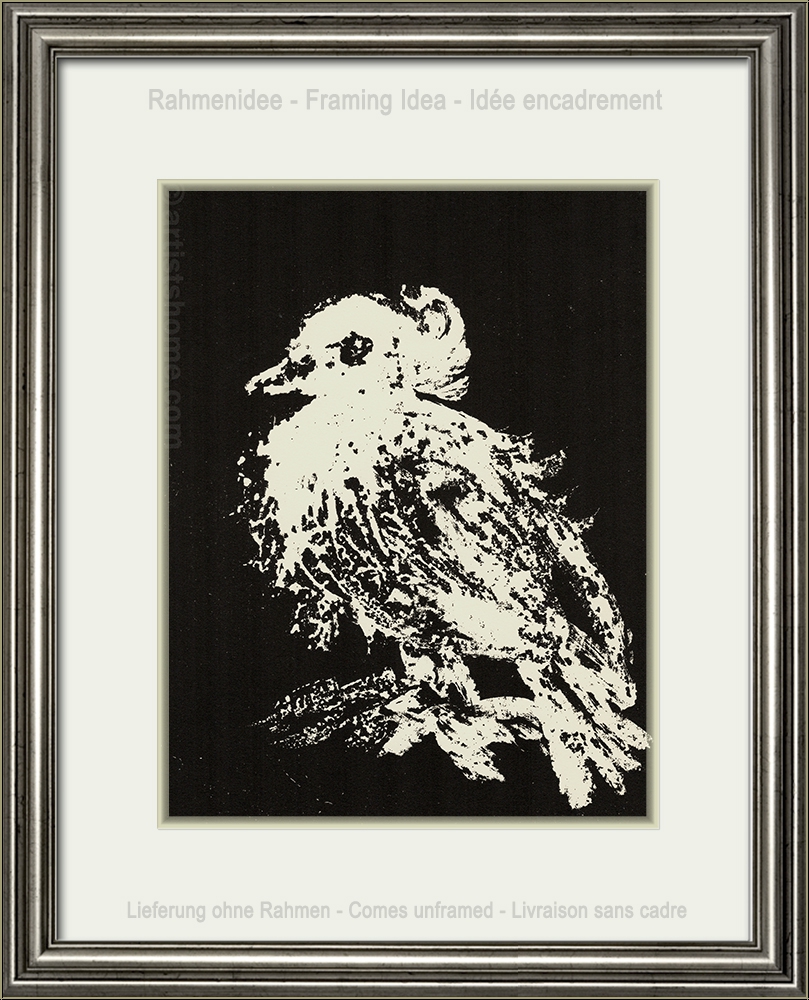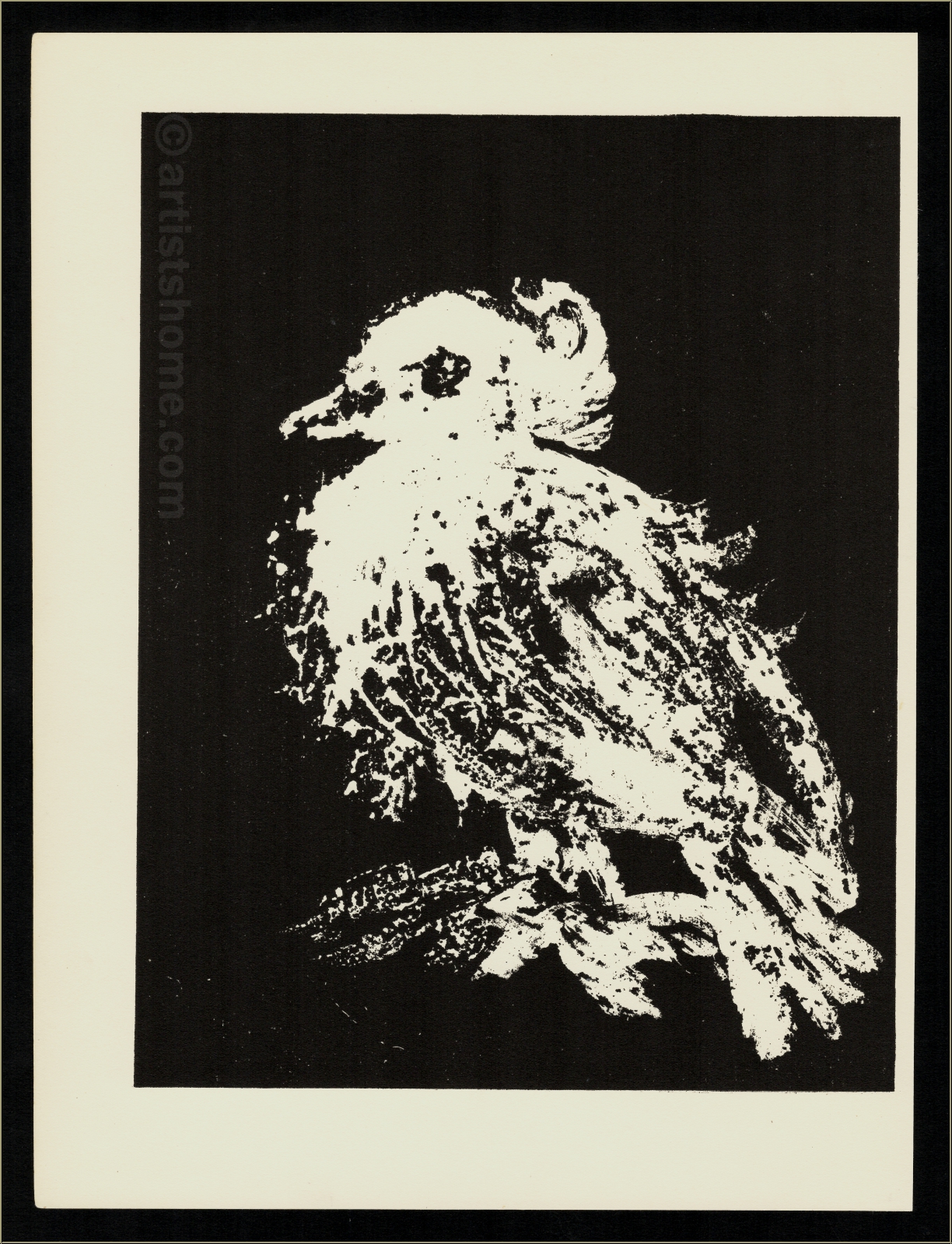 Seine erste Taube zeichnete Picasso im Januar 1949, die noch im selben Jahr als Motiv für eines seiner bekanntesten Plakate verwendet wurde, der Bekanntmachung des Weltfriedenskongresses in Paris. Zwei Monate später, im März 1949, arbeitete er zwei weitere, etwas kleinere Taubenmotive ("Petit pigeon", Mourlot Nr. 173, und "La petite colombe", Mourlot Nr. 174), wovon nur letzteres in Druck ging, als Frontispiz-Grafik in einer Auflage von 2.500 Exemplaren für den ersten Band des lithographischen Werkverzeichnisses. Exakt eines dieser Blätter bieten wir Ihnen hier an.