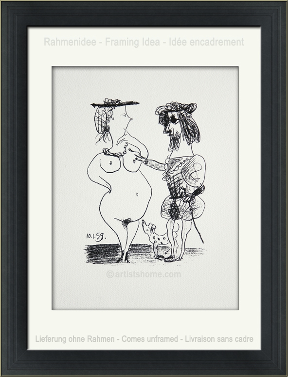 | | "Le seigneur et la dame" (Der Edelmann und die Dame) Picasso arbeitete diesen köstlich-frechen Steindruck in Schwarz bereits im Jahr 1959, er wurde jedoch als alleinige Auflage erstmals im Jahr 1972 gedruckt. Eine der seltenen Original-Lithographien Picassos, die damals in Fernand Mourlots berühmtem Portfolio "Souvenirs et portraits d'artistes" veröffentlicht wurde. Eines der 800 Exemplare befindet sich auch im Fine Arts Museums of San Francisco. Dies ist KEINE später gedruckte Kaufhaus-Massenware (Kunstdruck wie z.B. Grano- oder Offset-Lithographie), sondern die Original-Lithographie für die Vorzugsausgabe von Mourlots Buch über sein Lebenswerk. ACHTUNG: aktuell werden im Netz identisch aussehende Drucke angeboten - hierbei handelt es sich um gefälschte Nachdrucke (Raubkopien). Diese Grafiken sind KEINE Original-Lithographien, auch wenn sie auf der Rückseite mit "Lithographie originale" bedruckt und für den Laien kaum zu unterscheiden sind! | Auflage: | Eines von 800 unsignierten Exemplaren für die Vorzugsausgabe, in der Platte datiert "10.1.1959". | | Größe: | 32,5 x 25 cm (Blattgröße) | | Verleger: | Alain C. Mazo, Paris u. Léon Amiel, New York, 1972 | | Anmerkung: | Rücks. typografisch bezeichnet: Pablo Picasso - Le seigneur et la dame (M.322) - Lithographie originale. | Werkverzeichnis/ Referenz: | [1] Mourlot, Fernand. Picasso Lithograph. André Sauret, Paris 1970, S. 258, Nr. 322 [2] Picasso, Pablo: Die illustrierten Bücher. Kupferstichkabinett Basel. Gerd Hatje Verlag, 1995, S. 194, Nr. 153. Sie erhalten mit der Lieferung den vollständigen Auszug aus den o.g. Werkverzeichnissen, sowie einen Identitätsnachweis (ohne Preisangabe, falls das Blatt verschenkt werden soll). Außerdem erhalten Sie eine Kopie der Impressumseite mit der Nummerierung aus der Originalkassette zu Ihrem Blatt. | | | Dieses Blatt wird durch unseren Geschenk-Service verpackt Kundenbewertungen Bisher wurde noch keine Bewertung abgegeben. Bewertungen können nur von Kunden geschrieben werden, die den Artikel gekauft haben und eingeloggt sind. Ihre persönlichen Daten werden automatisch anonymisiert (Beispiel: "Jens H., Deutschland").  *Gültig für Lieferungen nach Deutschland bei Zahlung per PayPal. Bei Zahlung per Banküberweisung verlängert sich die Lieferzeit um 1-3 Tage ab dem Tag, an dem Sie überwiesen haben. Lieferzeiten für andere Länder sowie Informationen zur Berechnung des Liefertermins finden Sie hier |