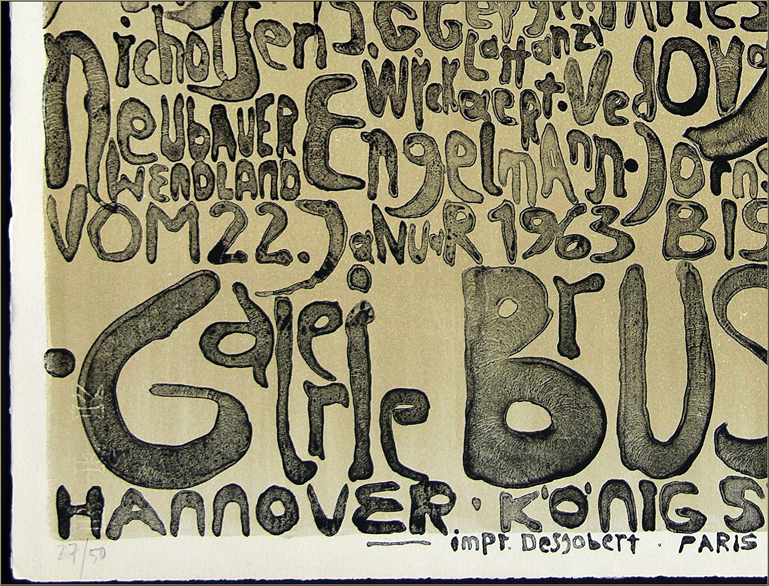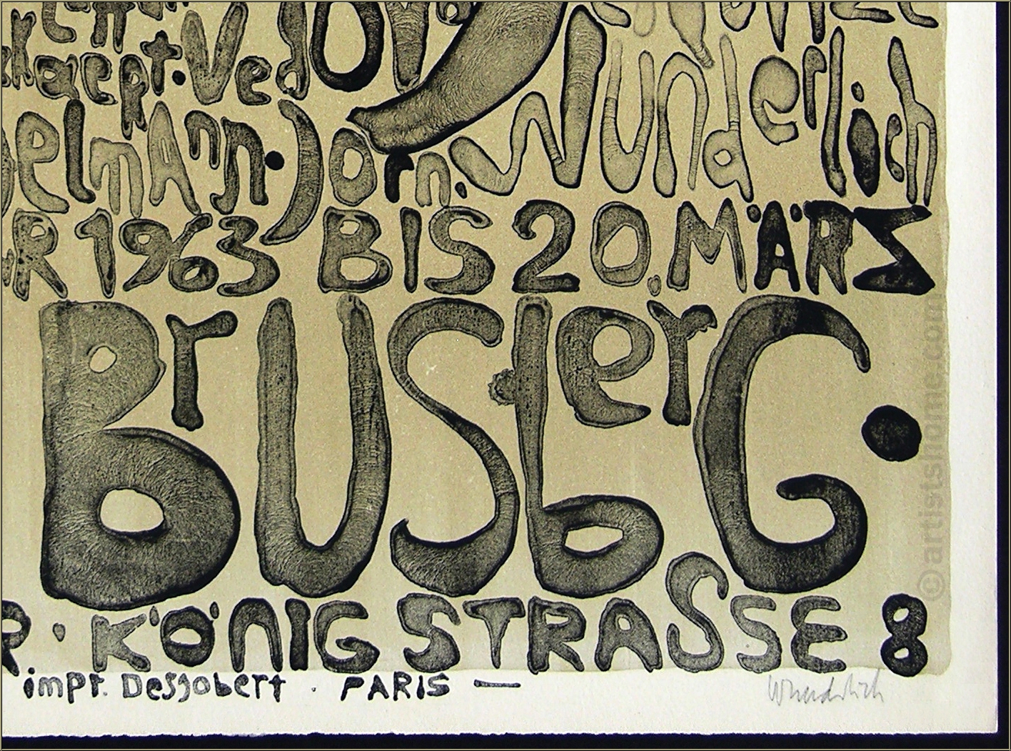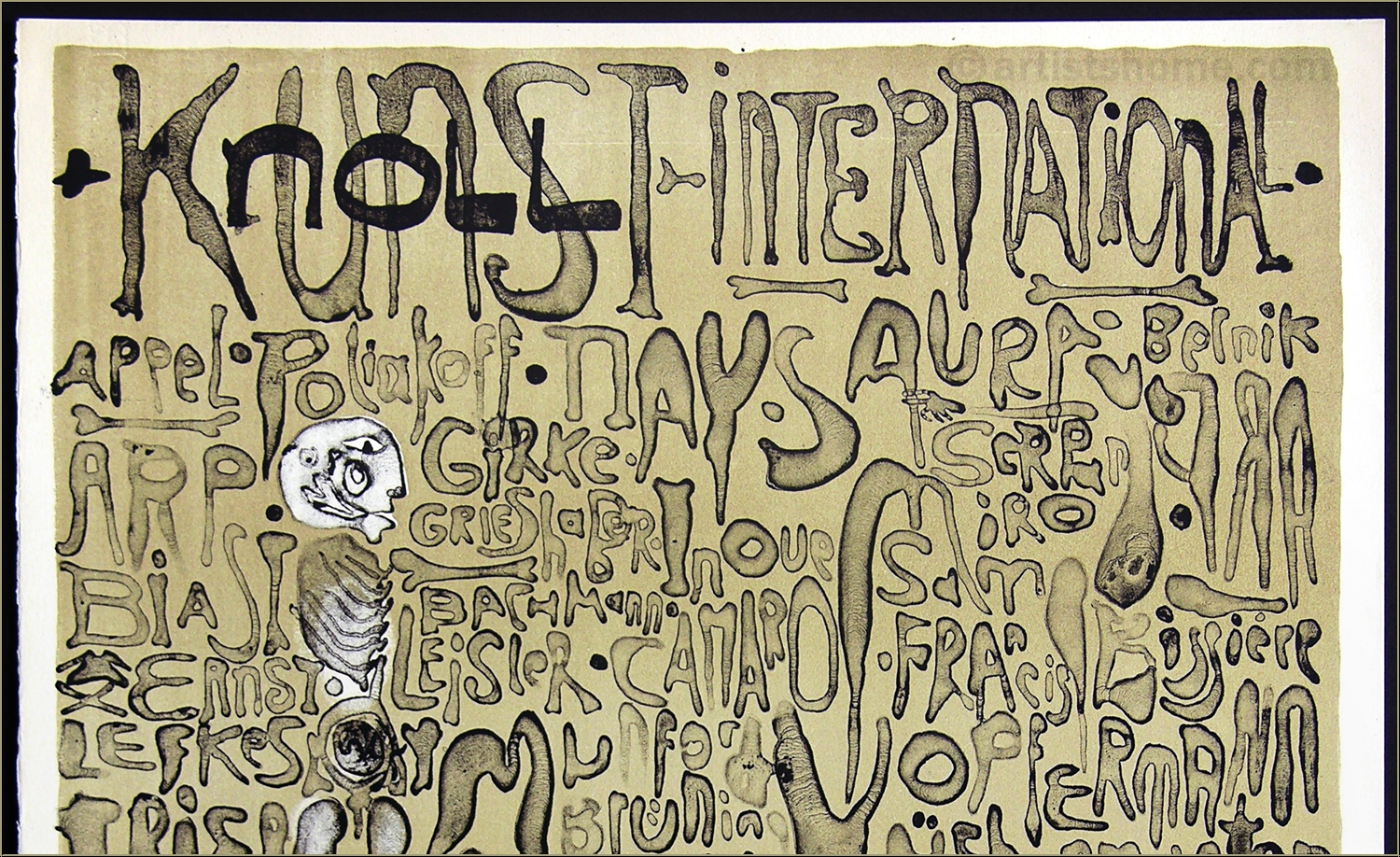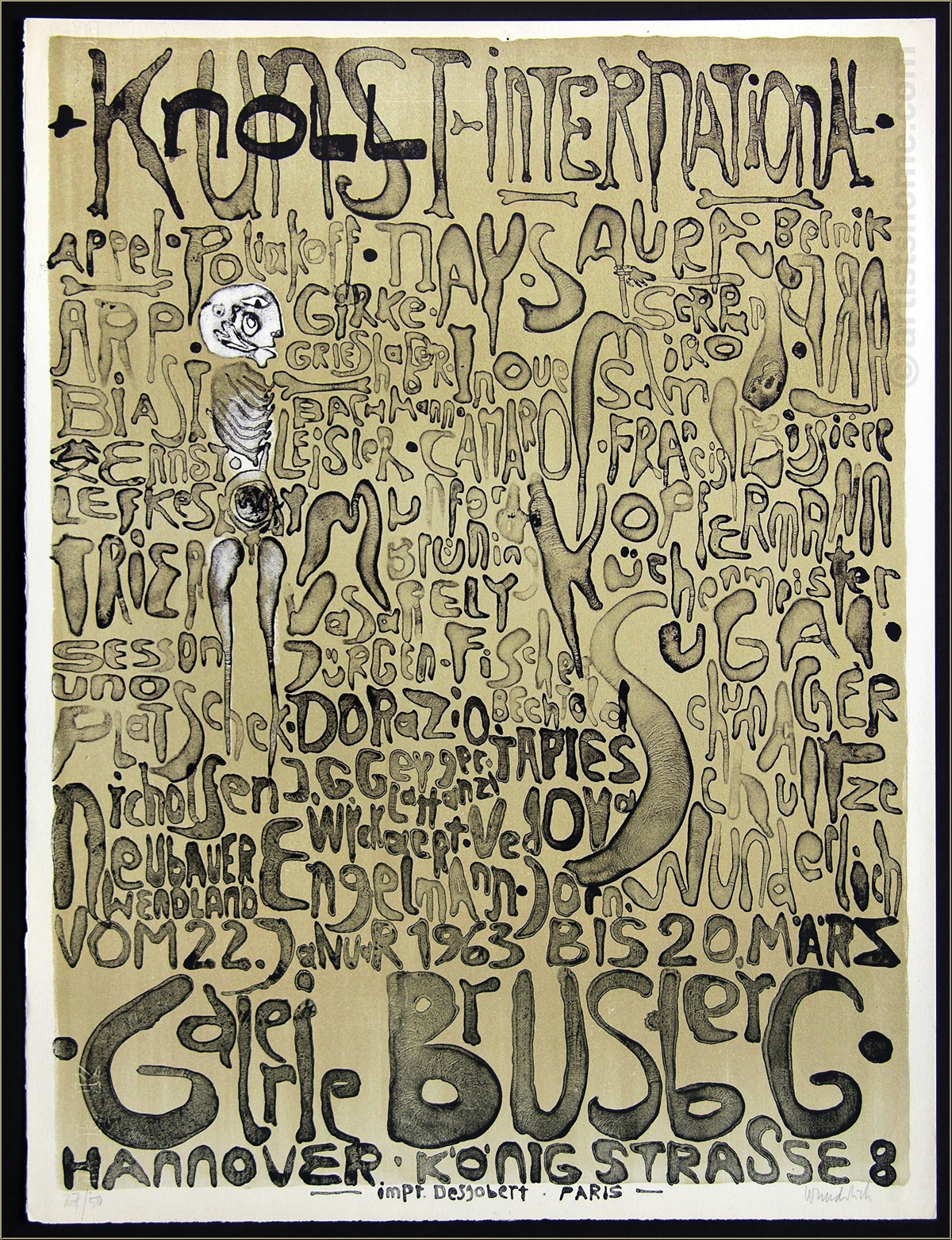 Details:"Kunst + Knoll International" Nicht selten ging Paul Wunderlich in seinen frühen druckgrafischen Werken einem "lesenswerten" Hobby nach - dem der künstlerischen Typografie. Für dieses seltene Originalplakat zu einer Ausstellung von KNOLL Kunst (heute Knoll.art) 1963 in der Galerie Brusberg zeichnete Wunderlich seine Buchstaben als skurril geformte Körperteile, erkennbar an der hautartigen Oberflächenstruktur samt Poren und Runzeln. Dass er dabei im Eifer des Gefechts in mindestens einen Namen der im Plakat aufgelisteten, vertretenen Künstler einen Schreibfehler bastelte, scheint seinerzeit niemandem aufgefallen zu sein. Hier eines der wenigen signierten und nummerierten Exemplare dieses frühen Plakates auf BFK Rives-Bütten, in sehr guter Erhaltung.
