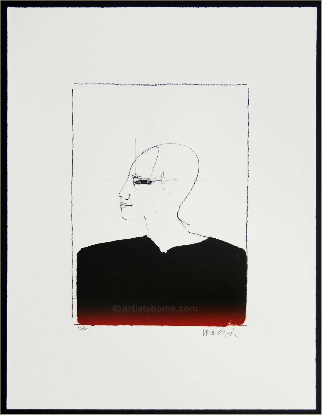 Details:"Im Profil mit Archaeopteryx" Im Laufe seines Lebens als Maler und Bildhauer ließ sich Paul Wunderlich immer wieder von prähistorischen Lebewesen und Gegenständen zu Bildern inspirieren. 1994 experimentierte er mit der stilisierten Darstellung eines fliegenden Archaeopteryx, den er mal auf der Stirn, mal am Hals und schließlich an der Schläfe in verschiedenen Portraits in Form eines Bildsignets anbrachte. Damit setzte er - zumindest für sich selbst - dem andauernden Streit von Wissenschaftlern ein Ende, ob das gefiederte Tier noch flugunfähiger Saurier war, oder bereits als Urvogel zu gelten hat. Vielleicht hat ihn aber auch lediglich die wissenschaftliche Bezeichnung Archaeopteryx lithographica dazu angeregt, diesen als Bildzeichen für einige seiner Lithographien zu verwenden. Durch seine schlichte, nahezu monochrom gearbeitete Bildkonstruktion übt dieses Portrait mit den von Wunderlich gern idealisierten Zügen einer androgynen Nofretete eine eigentümliche Faszination aus.