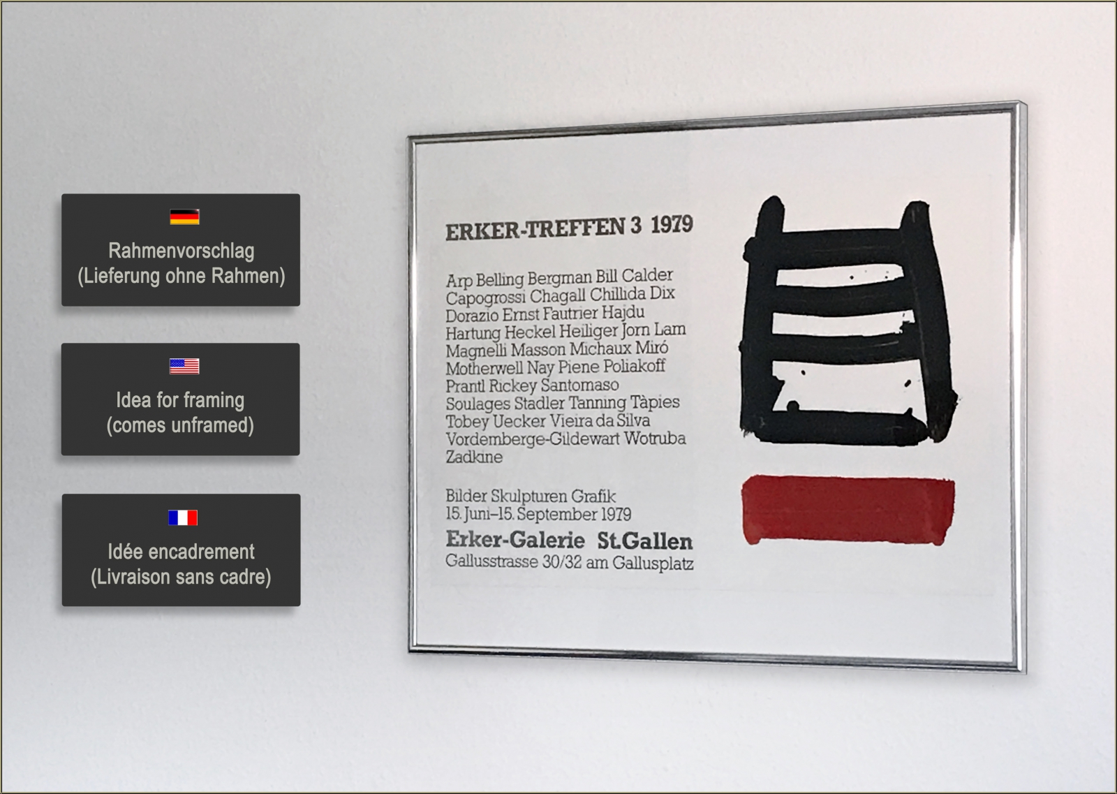 | | "Lithographie Nr. 40" - 1978 Seltene Original-Farblithographie von Pierre Soulages für "Erker-Treffen 3", 1979. | Beschreibung: | Diese Original-Lithographie war der Beitrag von Pierre Soulages für das Album "Jean Cassou. Vingt-deux poèmes". Das Motiv wurde im Jahr darauf von der gleichen Vorlage für die Ankündigung zum Erker-Treffen 3 in St. Gallen gedruckt. | | Jahr: | 1978 (für die Lithographie) - 1979 (für das Plakat) | | Größen: | 38 x 56 cm (Papier), 33 x 21,5 cm (Darstellung) | | Auflage | Papier: | 150 signierte u. nummerierte Exemplare auf Rives Bütten; Hier ein Exemplar aus der Auflage mit Text für Erker Treffen 3 auf glattem, kräftigem Vélin | | Signiert: | unsigniert, wie erschienen | | Druck: | Erker-Presse, St. Gallen, Schweiz | | Verleger: | Erker-Galerie, St. Gallen, Schweiz | Werkverzeichnis/ Referenz: | Encrevé, Pierre et al., Soulages - l'oeuvre imprimé, 2003, Bibliothèque nationale de France, Seite 191, Nr. 89 Sie erhaltenen mit der Lieferung den Auszug aus dem o.g. Werkverzeichnis | | Zustand: | Erläuterungen hierzu Sehr guter Zustand, schönes Exemplar. Lieferung ungerahmt. | Kundenbewertungen Bisher wurde noch keine Bewertung abgegeben. Bewertungen können nur von Kunden geschrieben werden, die den Artikel gekauft haben und eingeloggt sind. Ihre persönlichen Daten werden automatisch anonymisiert (Beispiel: "Jens H., Deutschland").  *Gültig für Lieferungen nach Deutschland bei Zahlung per PayPal. Bei Zahlung per Banküberweisung verlängert sich die Lieferzeit um 1-3 Tage ab dem Tag, an dem Sie überwiesen haben. Lieferzeiten für andere Länder sowie Informationen zur Berechnung des Liefertermins finden Sie hier |