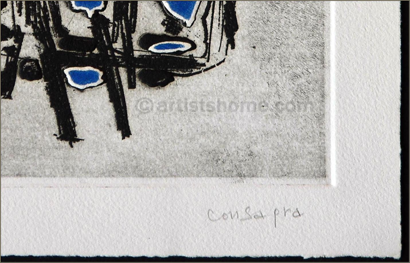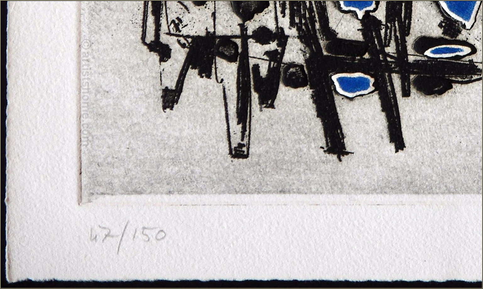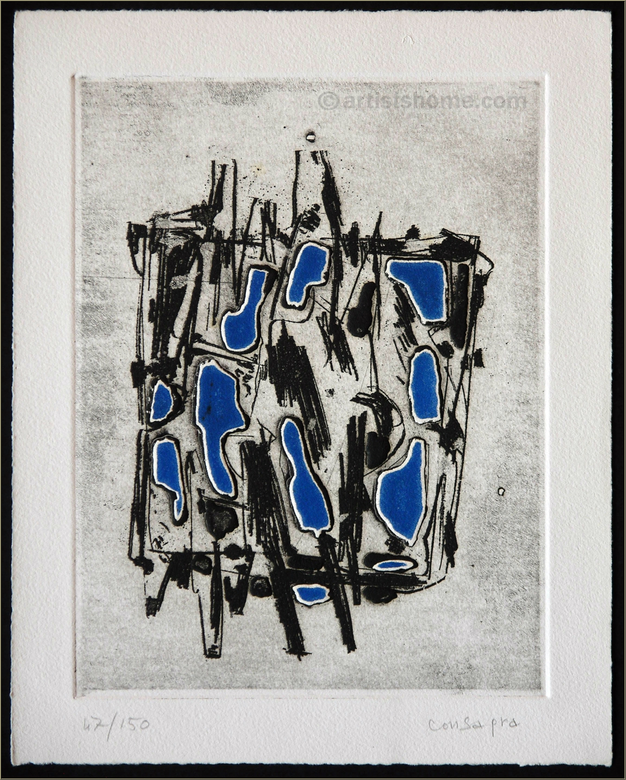 Details:Abstrakte Komposition - 1962 Wunderschöne, gratige Farbradierung des Künstlers für die Vorzugsausgabe der 1962 erschienenen Monographie über sein plastisches Werk. Die mit weißen Konturen hinterlegten tiefblauen Flächen wurden mit der Carborundum-Technik erhaben geprägt und bilden einen herrlichen Kontrast zu den schwarzen Radierelementen.