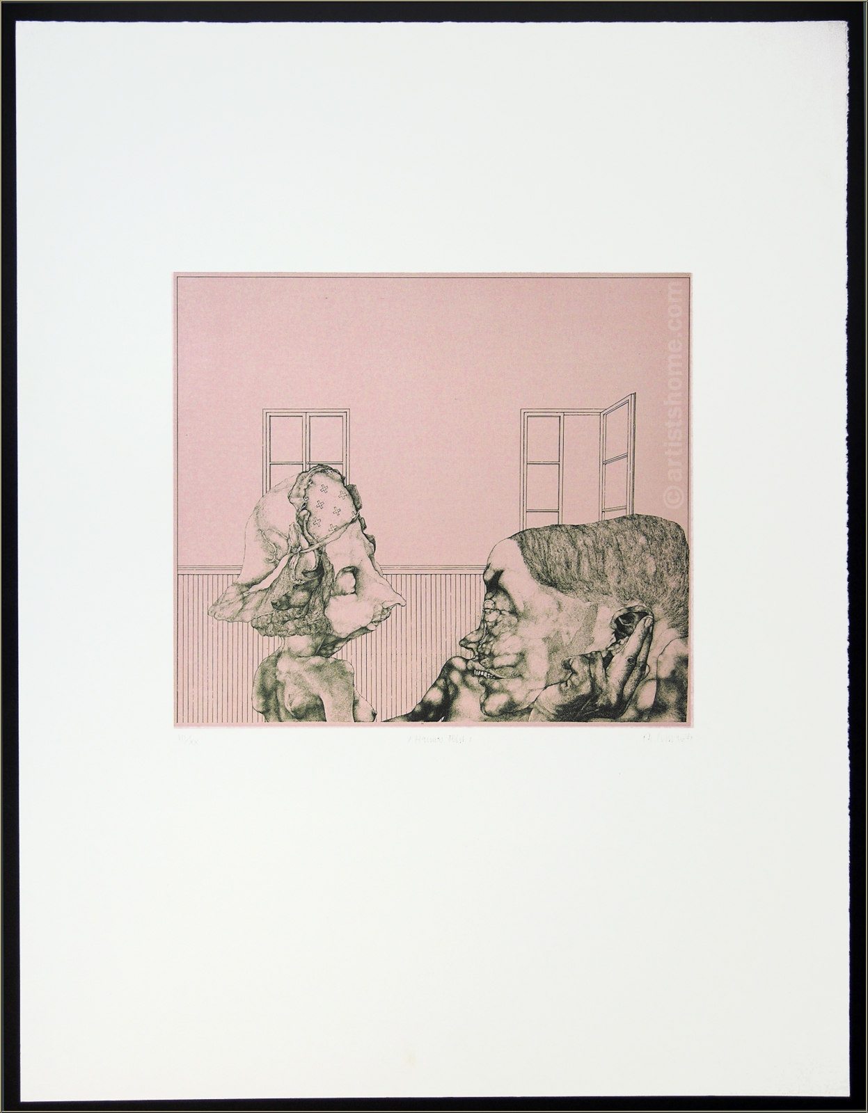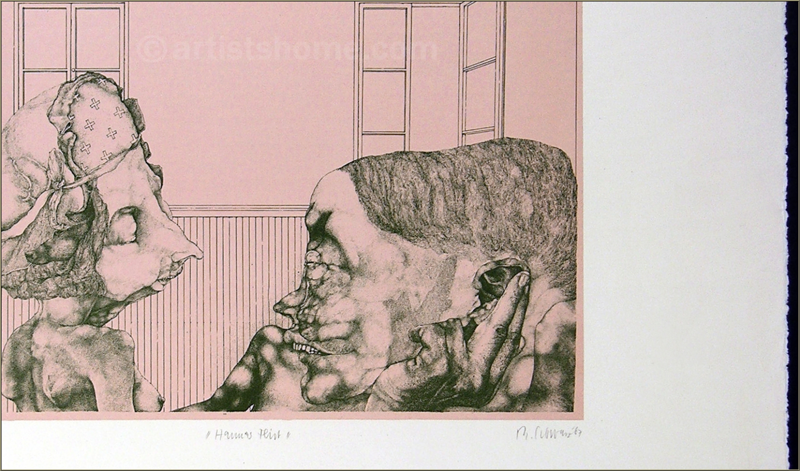 Details:"Hannas Flirt" - 1967 Wer auch immer Hanna war bzw. ist - das Portrait der flirtenden Dame mit Häubchen und entblößter Brust ist eine der frühen Lithographien des Künstlers, die er zudem selbst druckte.