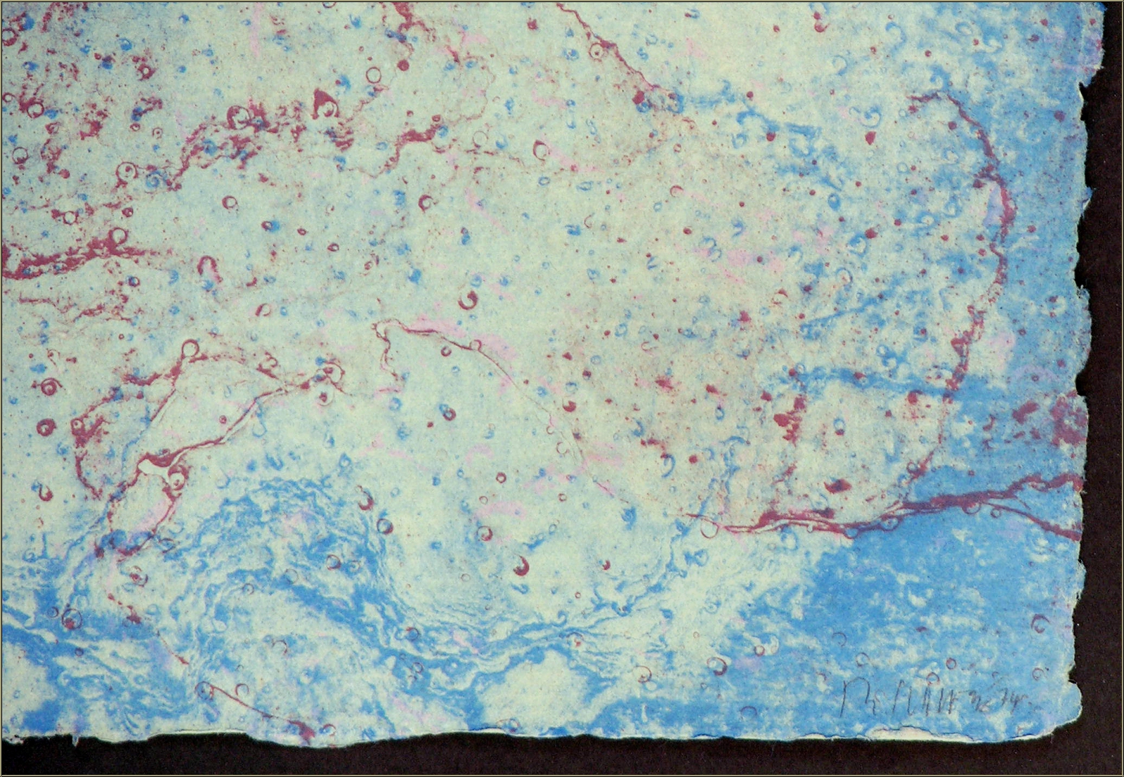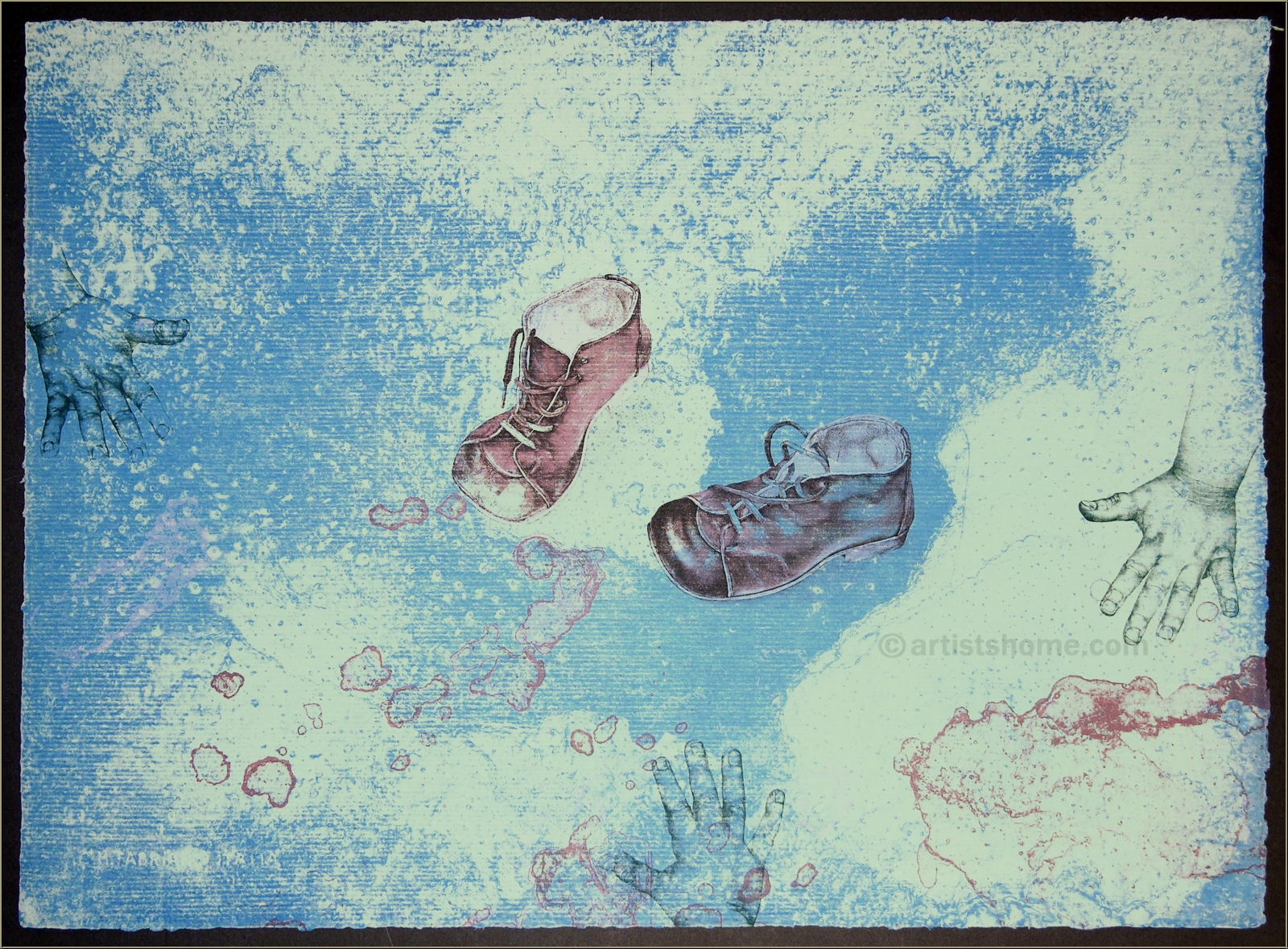 Details:"Kinderspiel" - Unikat: Rotbraune Kinderschuhe vor Blau auf hellgrünem Bütten Mit dieser aus 81 Unikaten bestehenden Kinderschuh-Serie machte Reiner Schwarz 1974 sozusagen die Jungfernfahrt in seiner eigenen Druckwerkstatt im Berliner Kreuzberg. Dass er sich gleich zu Anfang ein solches Mammutprojekt vornahm, kommt einem experimentierfreudigen Befreiungsschlag gleich, mit dem sich der Künstler aus den Zwängen der bis dato genutzten Hochschulpresse löste. Diese arabisch nummerierte "Kinderspiel"-Serie wurde von Schwarz mit sechs Platten in wechselnden Farben auf insgesamt neun verschiedenfarbige Papiere als Unikatauflage gedruckt, sodass jede Farbvariante nur einmal existiert. Als Druckträger verwendete er ein handgeschöpftes, fein geripptes Büttenpapier von Fabriano Italia, mit deren Roma-Wasserzeichen der Romulus und Remus säugenden Wölfin.