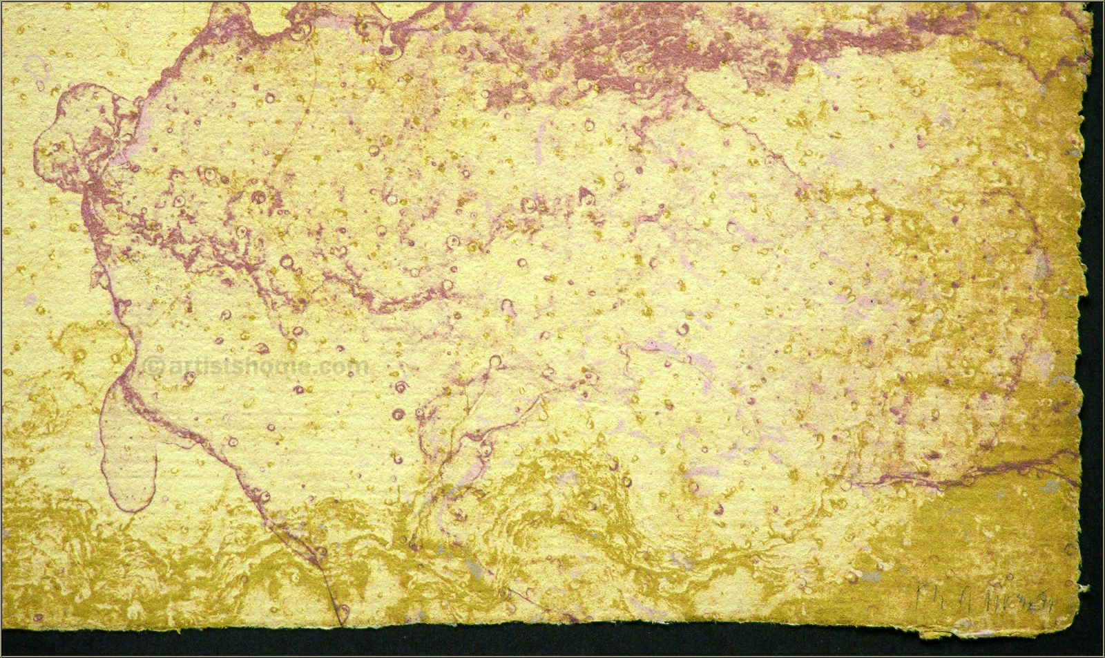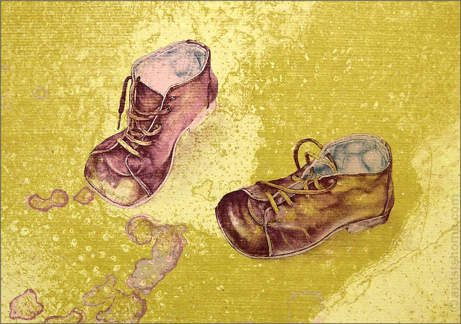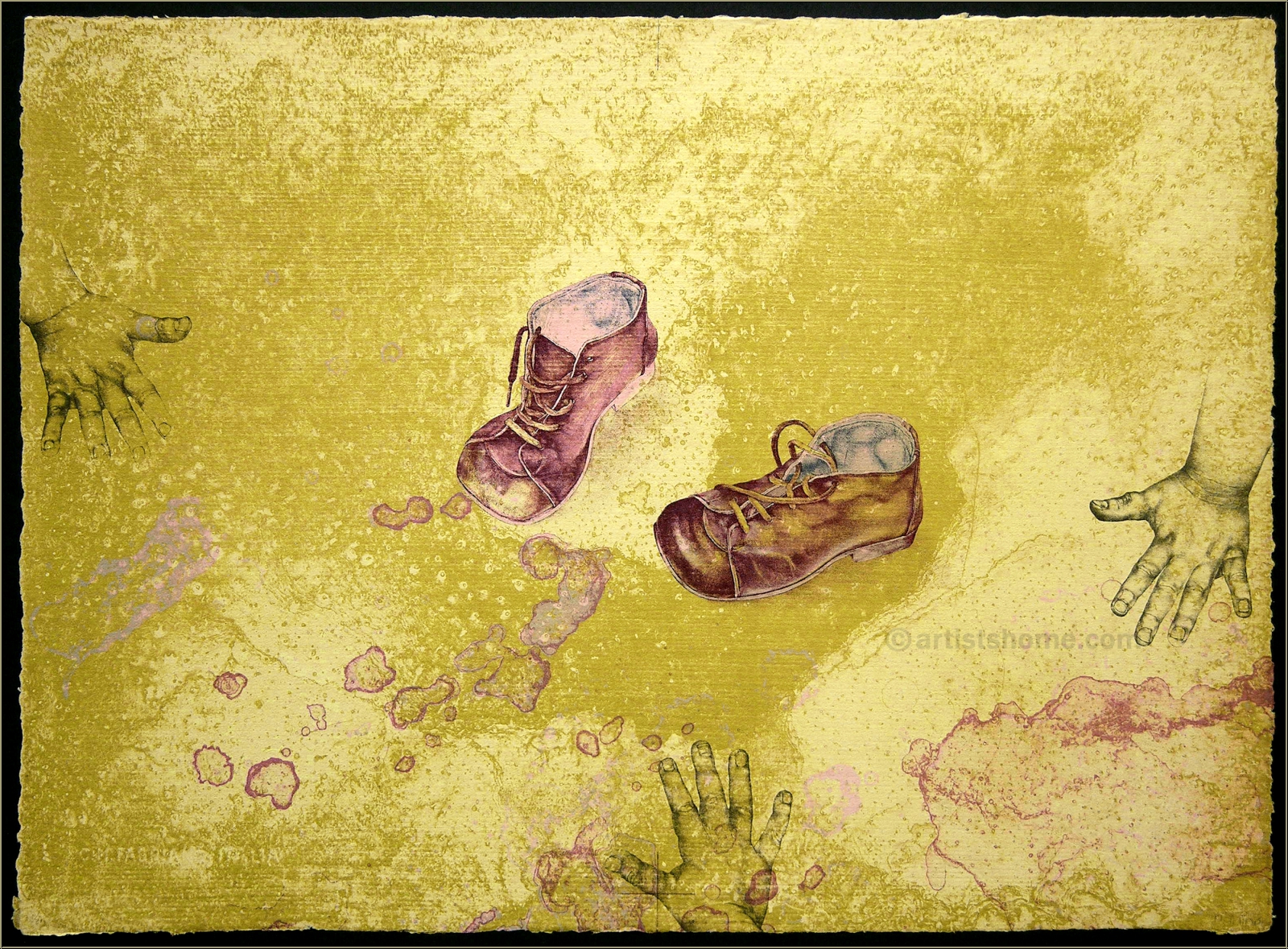 Details:"Kinderspiel" - Unikat: Rotbraune Kinderschuhe vor gelbem Hintergrund auf hellgelbem Bütten Mit dieser aus 81 Unikaten bestehenden Kinderschuh-Serie hob Reiner Schwarz 1974 seine eigene Druckwerkstatt in Berlin Kreuzberg aus der Taufe. Dass er sich gleich zu Anfang ein so komplexes Druckprojekt vornahm, kommt einem experimentierfreudigen Befreiungsschlag gleich, mit dem sich der Künstler aus den Zwängen der bis dato genutzten Hochschulpresse löste. Diese bemerkenswerte Grafikserie wurde von Reiner Schwarz mit sechs Platten in wechselnden Farben auf insgesamt neun verschiedenfarbige Papiere als Unikatauflage gedruckt - jede Farbvariante existiert also nur ein Mal. Als Druckträger verwendete er ein handgeschöpftes, fein geripptes Büttenpapier von Fabriano Italia, mit deren Roma-Wasserzeichen der Romulus und Remus säugenden Wölfin.