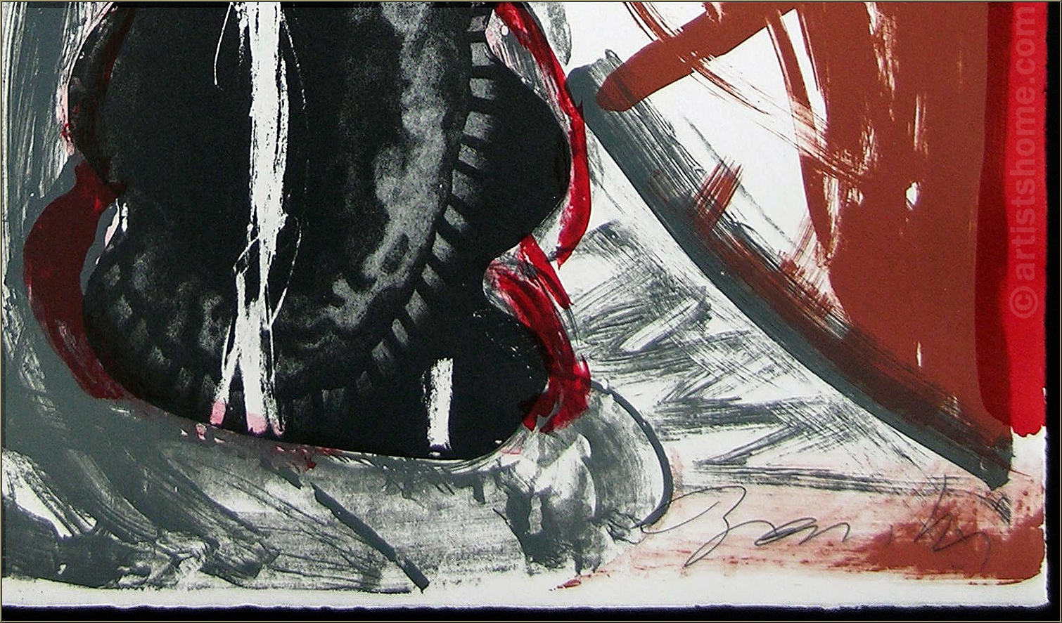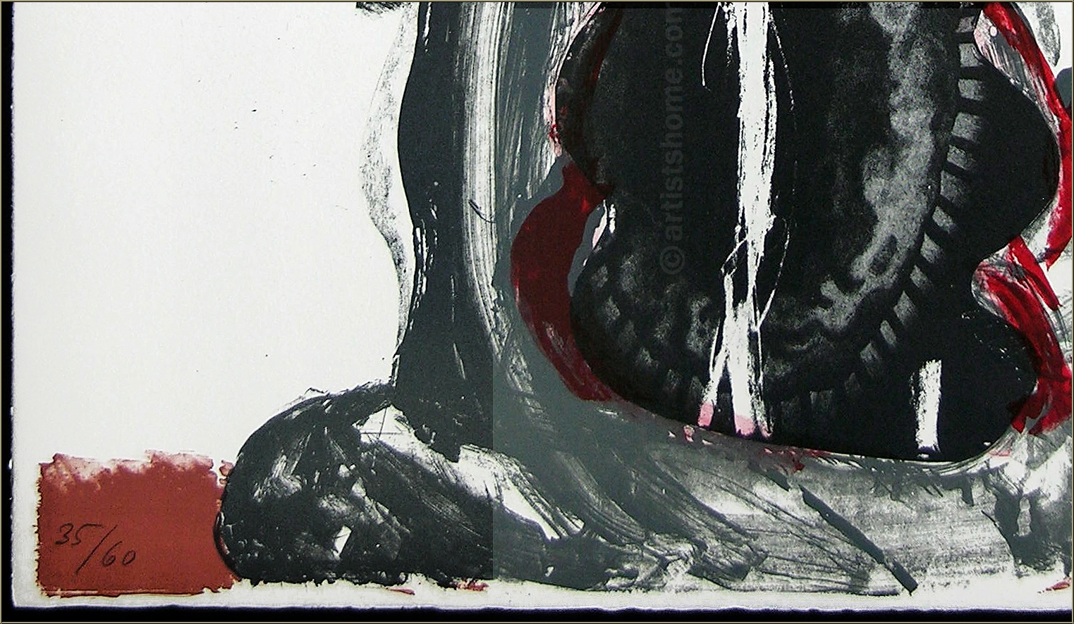 Details:"Stehender Leib" Zu seiner im gleichen Jahr vollendeten Serie von drei lebensgroßen Bronzeplastiken "Die Frauen von Messina" arbeitete Symanski zwei ebenfalls großformatige Farblithographien. Hier die Grafik "Stehender Leib", gedruckt in 4 Farben auf kräftigem Büttenpapier.