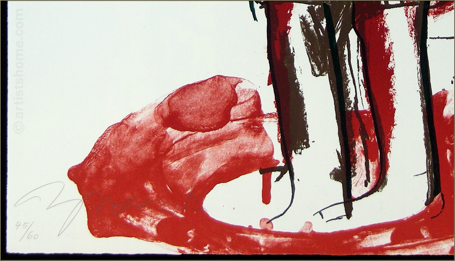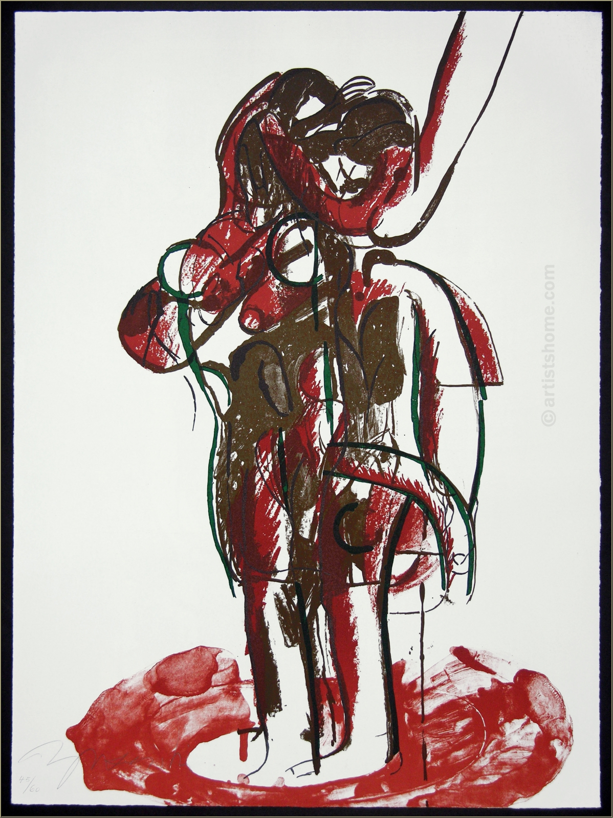 Details:"Spiegel II" - Figur in Rot, Braun, Dunkelgrün und Schwarz Nach längerer Abstinenz von seiner ohnehin spärlichen Druckgrafik wandte sich Rolf Szymanski 1971 endlich wieder dem Medium Lithographie zu. Das erfreuliche Ergebnis: 3 großformatige, bemerkenswerte Werke mit dem Titel "Spiegel I-III" für die Mappe "Portraits". Hier die zweite Grafik mit dem Titel "Spiegel II".