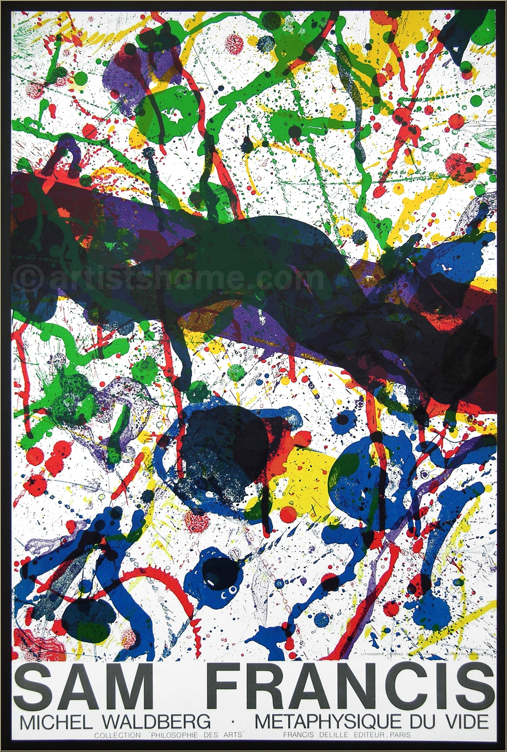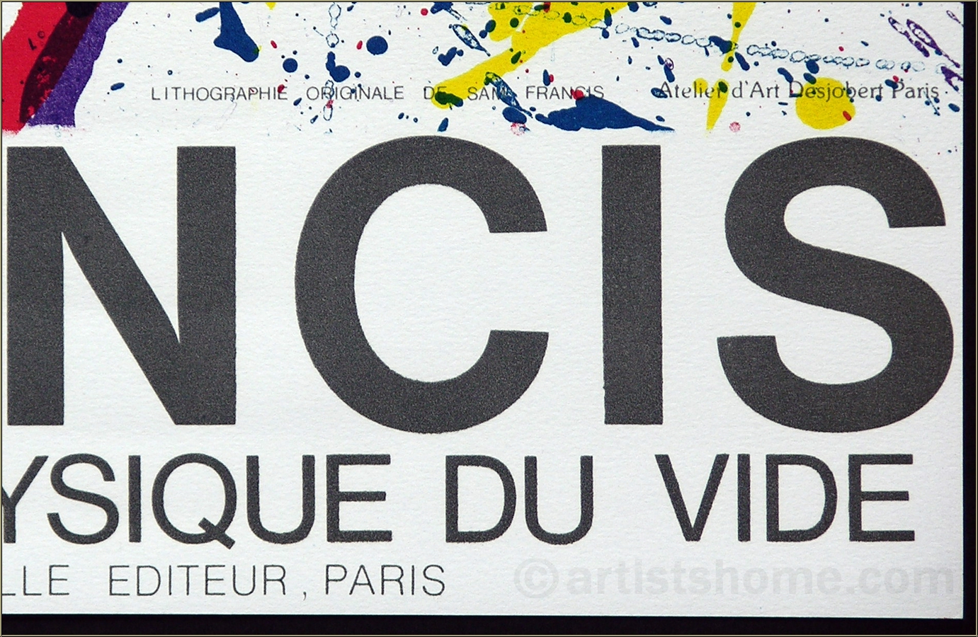 Details:"Sam Francis" - Original-Farblithographie auf Bütten Dieses Originalplakat von 1986 auf Bütten wurde mit einer großformatigen Original-Farblithographie des Künstlers aus dem gleichen Jahr ausgestattet, mit der der Schriftsteller und Photograph Michel Waldberg auch sein Gedicht "Poème dans le ciel" in seinem damals neu erschienenen Werk über Sam Francis "Métaphysique du vide" illustrierte.