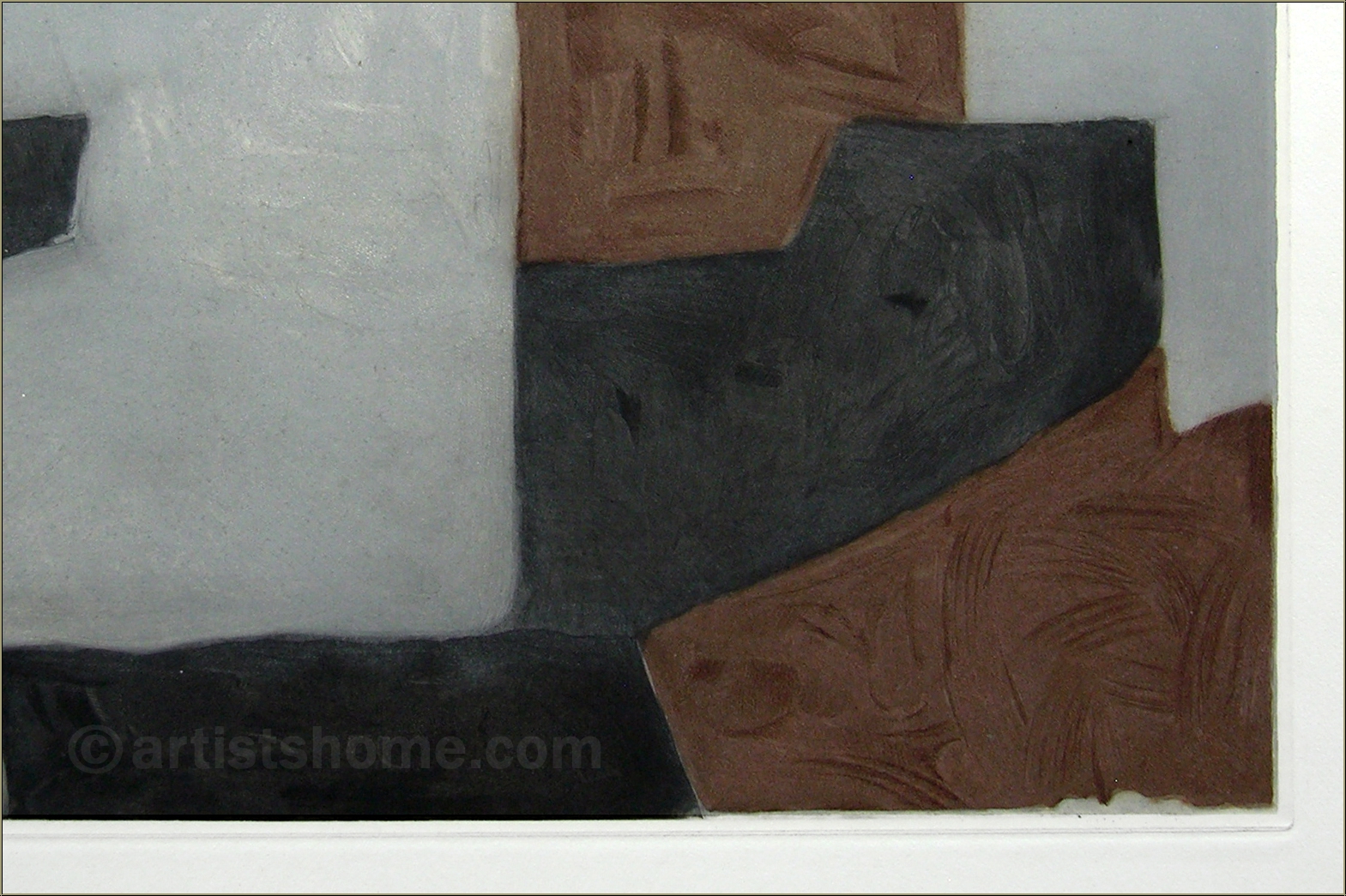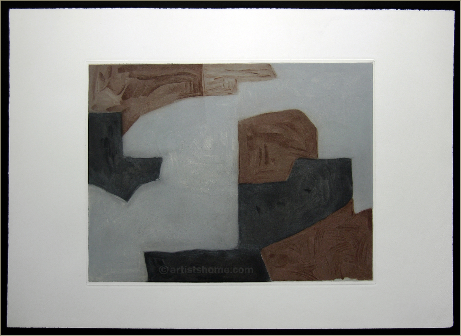 | | "Komposition in Braun, Grau und Schwarz" Außerordentlich seltener Abzug auf breitrandigem, kräftigem Bütten. Diese Aquatinta-Radierung wurde im Jahr 1964 in einer Auflage von 300 in der Mitte gefalteten Exemplaren dem Katalog der Ausstellung "Serge Poliakoff" in der Galerie "Der Spiegel", Köln, beigelegt. Laut Werkverzeichnis existieren nur wenige signierte Abzüge mit breitem Rand und ohne Falz. Hier ein unsigniert gebliebenes Exemplar dieser erstklassigen Radierarbeit des Künstlers in dunklen, erdigen Tönen, vermutlich ein Probeabzug. | Drucktechnik: | Radierung mit Aquatinta in 3 Farben | | Auflage / Papier: | Einer von nur wenigen Abzügen auf Büttenpapier mit breitem Rand, ohne Falzung. Darüber hinaus wurden 300 Exemplaren ohne Rand abgezogen und gefalzt. | | Jahr: | 1964 | | Größe: | 76 x 54 cm (Blattgröße) - 49 x 38 cm (Plattengröße) | | Verleger: | Galerie Der Spiegel, Köln | | Druck: | Felsing, Berlin | Werkverzeichnis/ Referenz: | Poliakoff, Alexis u. Schneider, Gérard. Serge Poliakoff. Grafik - Estampes - Prints, Werkverzeichnis der Graphik. Edition Galerie Française, München 1998, S. 226-227, Nr. XVII, mit Abb. Sie erhalten mit der Lieferung eine Kopie aus dem o.g. Werkverzeichnis zu Ihrem Blatt. | | Zustand: | Erläuterungen hierzu Sehr schönes, "unbefingertes" Exemplar aus dem Archiv! | Kundenbewertungen Bisher wurde noch keine Bewertung abgegeben. Bewertungen können nur von Kunden geschrieben werden, die den Artikel gekauft haben und eingeloggt sind. Ihre persönlichen Daten werden automatisch anonymisiert (Beispiel: "Jens H., Deutschland").  *Gültig für Lieferungen nach Deutschland bei Zahlung per PayPal. Bei Zahlung per Banküberweisung verlängert sich die Lieferzeit um 1-3 Tage ab dem Tag, an dem Sie überwiesen haben. Lieferzeiten für andere Länder sowie Informationen zur Berechnung des Liefertermins finden Sie hier |