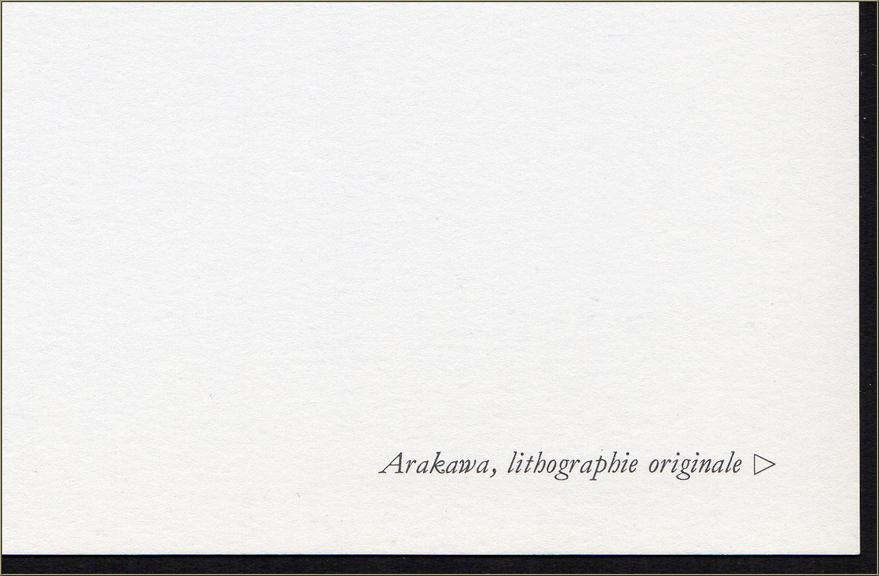 | | Original-Lithographie des japanischen Künstlers und Architekten Shusaku Arakawa aus dem obigen Portfolio, das 1982 anläßlich des Todes des bekannten französischen Verlegerpaares Maeght (1981 starb Aimé Maeght, 4 Jahre nach seiner Frau) von 24 "seiner" Künstler mit Originalgrafik ausgestattet wurde. | | Signiert: | unsigniert, wie 1982 erschienen | | Verleger: | Galerie Maeght, Paris, 1982 | | Anmerkungen: | Rückseitig typographisch bedruckt (u.a. mit "Arakawa, lithographie originale") und mit dem typischen Mittelfalz sowie Fadenheftungslöchlein, wie erschienen. | Werkverzeichnis/ Referenz: | Maeght Éditeur. Derriere le miroir 1946-1982. Maeght, Paris, 1983, S. 110 | | Kundenbewertungen Bisher wurde noch keine Bewertung abgegeben. Bewertungen können nur von Kunden geschrieben werden, die den Artikel gekauft haben und eingeloggt sind. Ihre persönlichen Daten werden automatisch anonymisiert (Beispiel: "Jens H., Deutschland").  *Gültig für Lieferungen nach Deutschland bei Zahlung per PayPal. Bei Zahlung per Banküberweisung verlängert sich die Lieferzeit um 1-3 Tage ab dem Tag, an dem Sie überwiesen haben. Lieferzeiten für andere Länder sowie Informationen zur Berechnung des Liefertermins finden Sie hier |