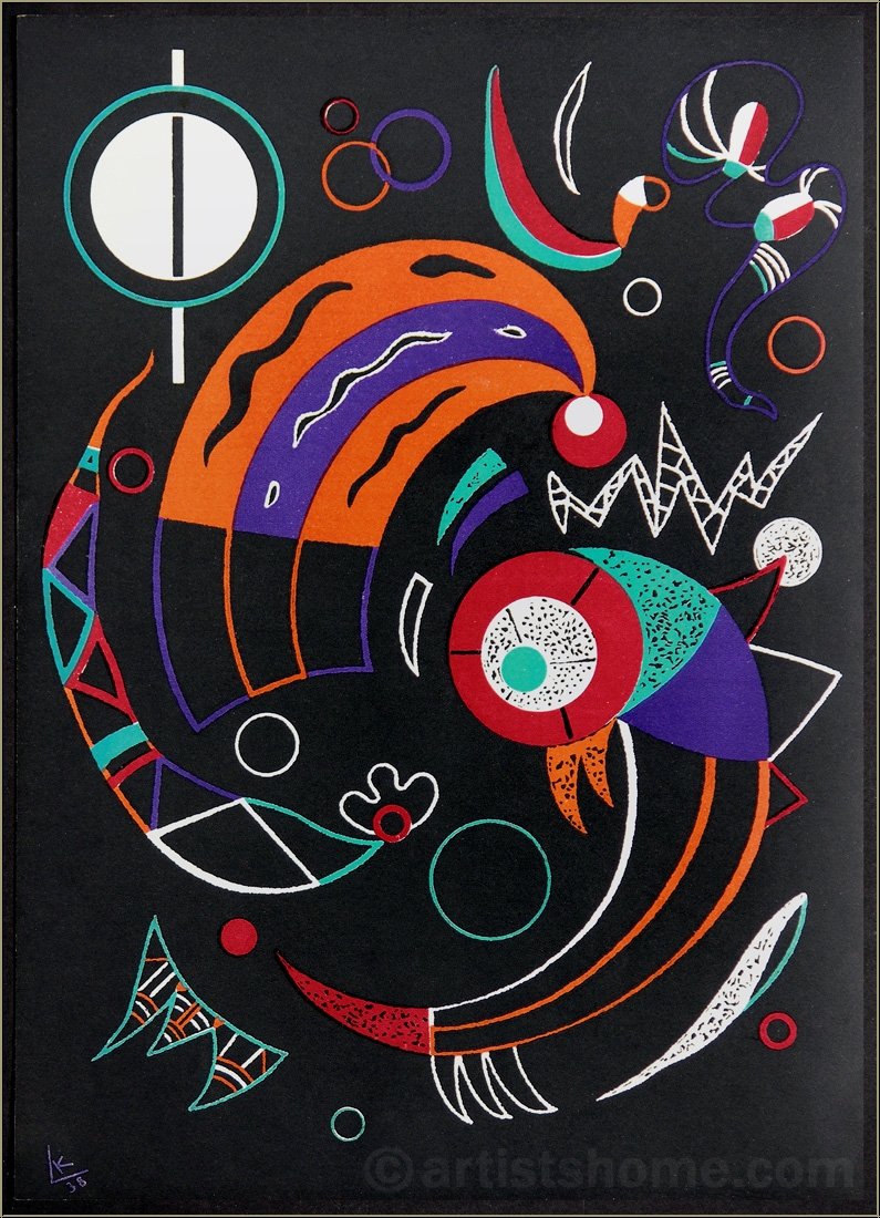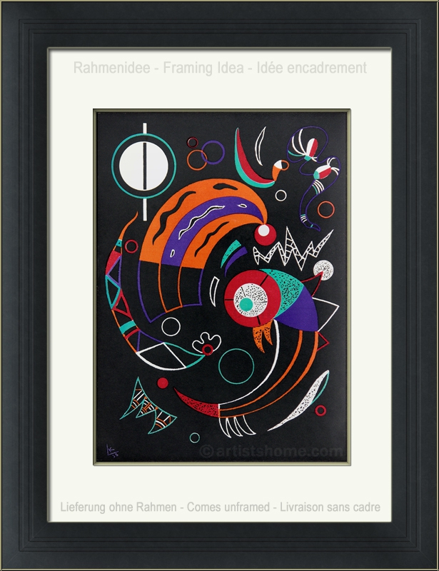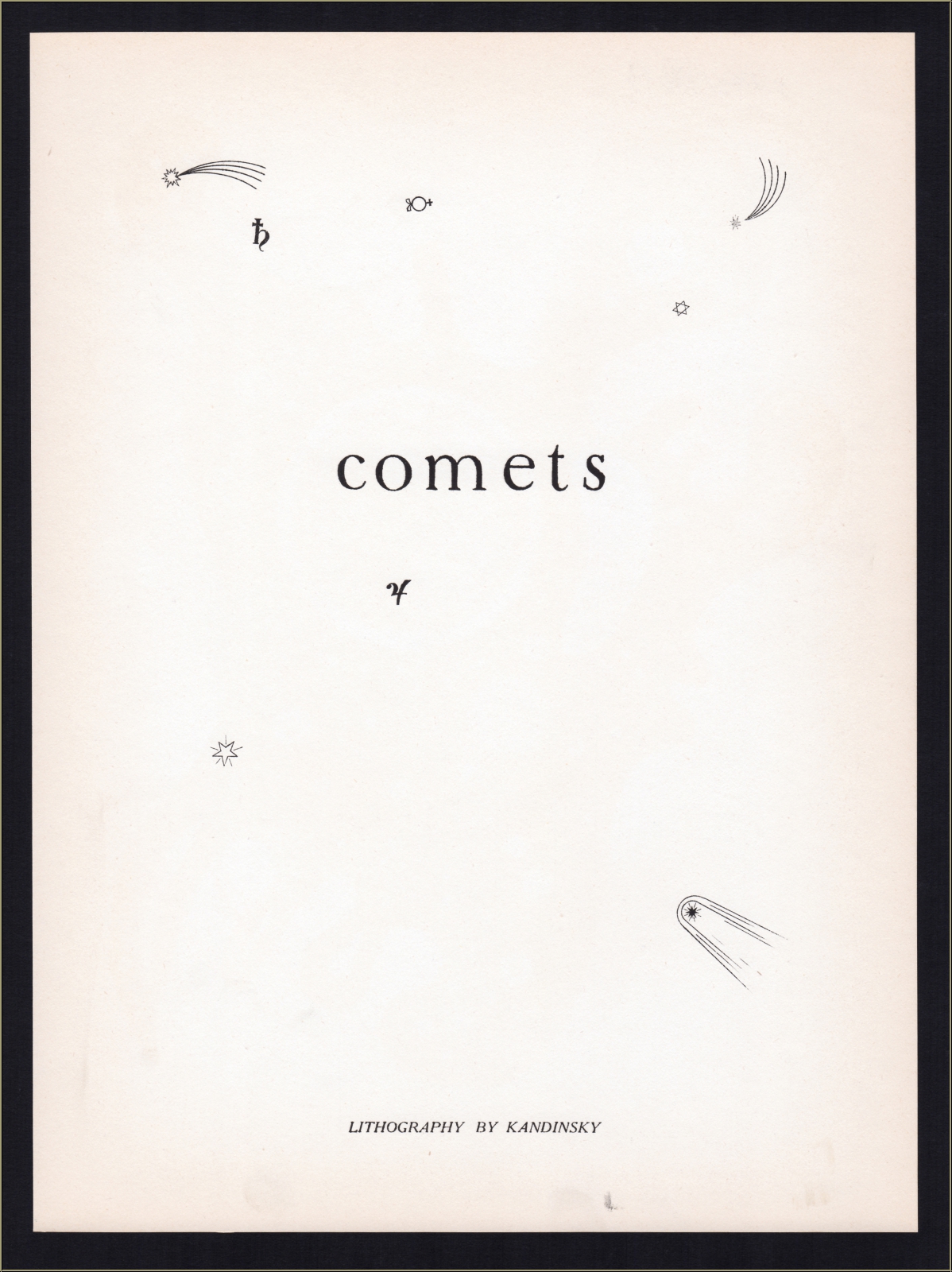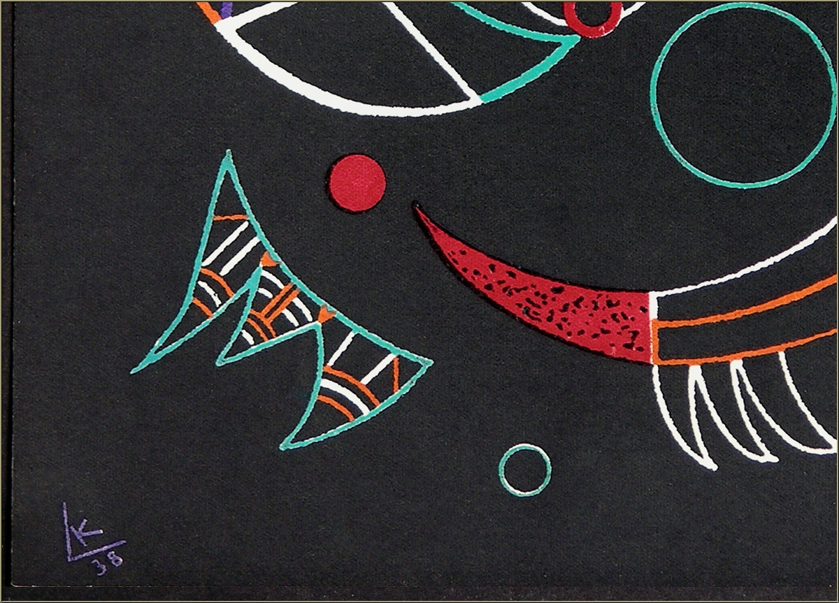 Details:"Kometen" (Comets / Comètes) Diese im Stein monogrammierte Lithographie mit dem Titel Kometen war einer von zwei Beiträgen Wassily Kandinskys in dem 1938 erschienenen Kunst- und Literaturmagazin Verve des französischen Verlegers Tériade. Ein Großteil dieser Ausgabe befasste sich seinerzeit mit recht eigenartigen Illustrationen aus dem 14. Jahrhundert unter dem Titel "Die 12 Wohnungen des Himmels", an die sich die "Kometen" und "Sterne" von Kandinsky, sowie "Der Mond" und "Die Sonne" von André Masson anschlossen.